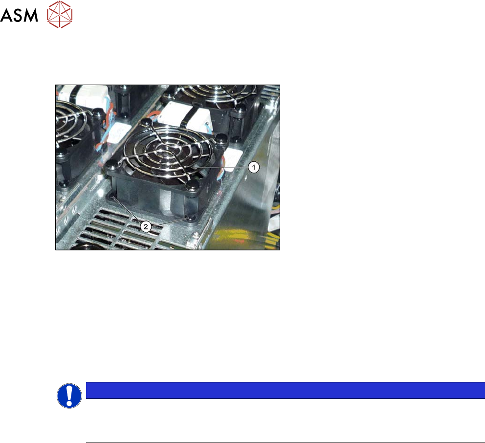 6 Gantries 6.5 GCU and MGCU 184 Service Manual SIPLACE X-Serie S 06/2019 6.5.2 Replacing the GCU fan Parts, equipment and tools Fig.233: Overview – fan on the GCU 1. GCU fan [03060954-xx] 2. Plastic expansion rivets (sn…