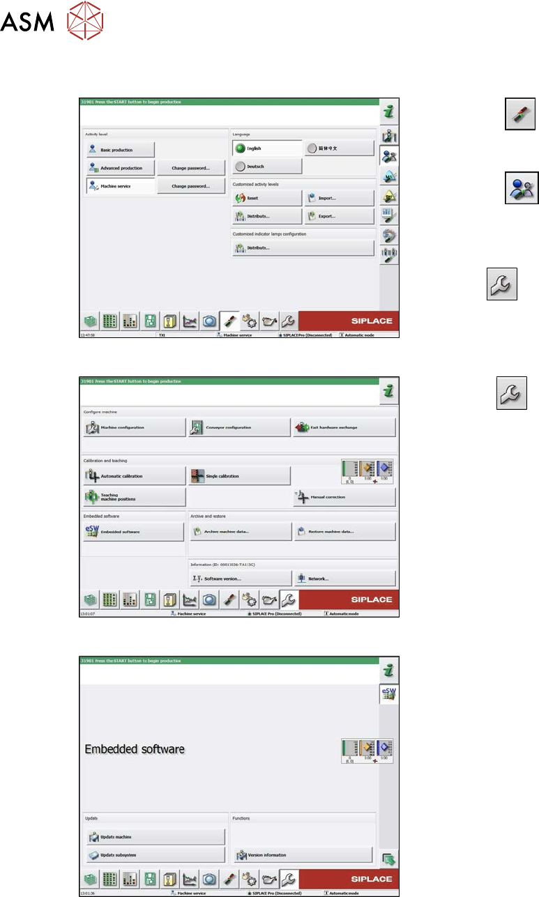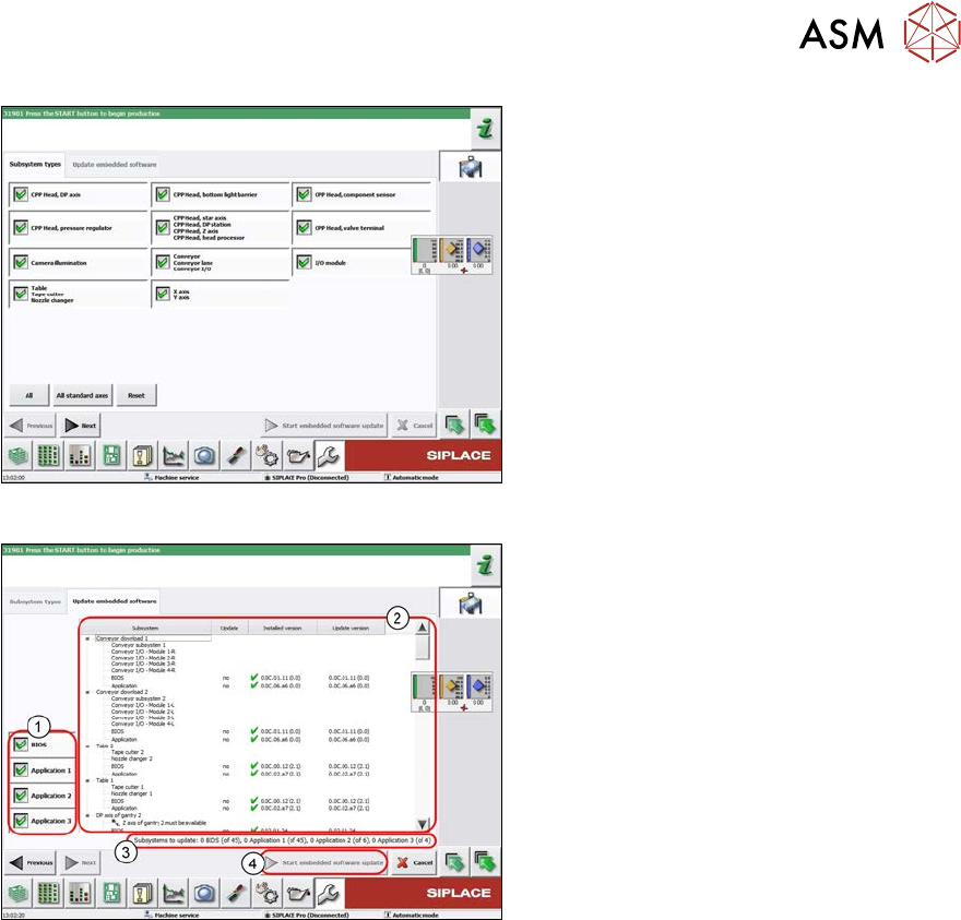 6 Gantries 6.9 eSW Download (SW 70x) Service Manual SIPLACE X-Serie S 06/2019 203 Fig.259: Select subsystem ► Select the subsystem for the eSW download. ► Click on the Continue button. Fig.260: Update machine menu 1. S…