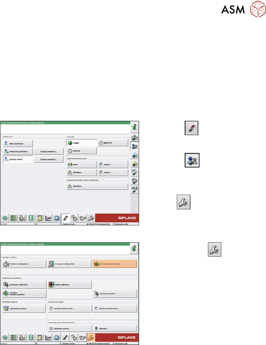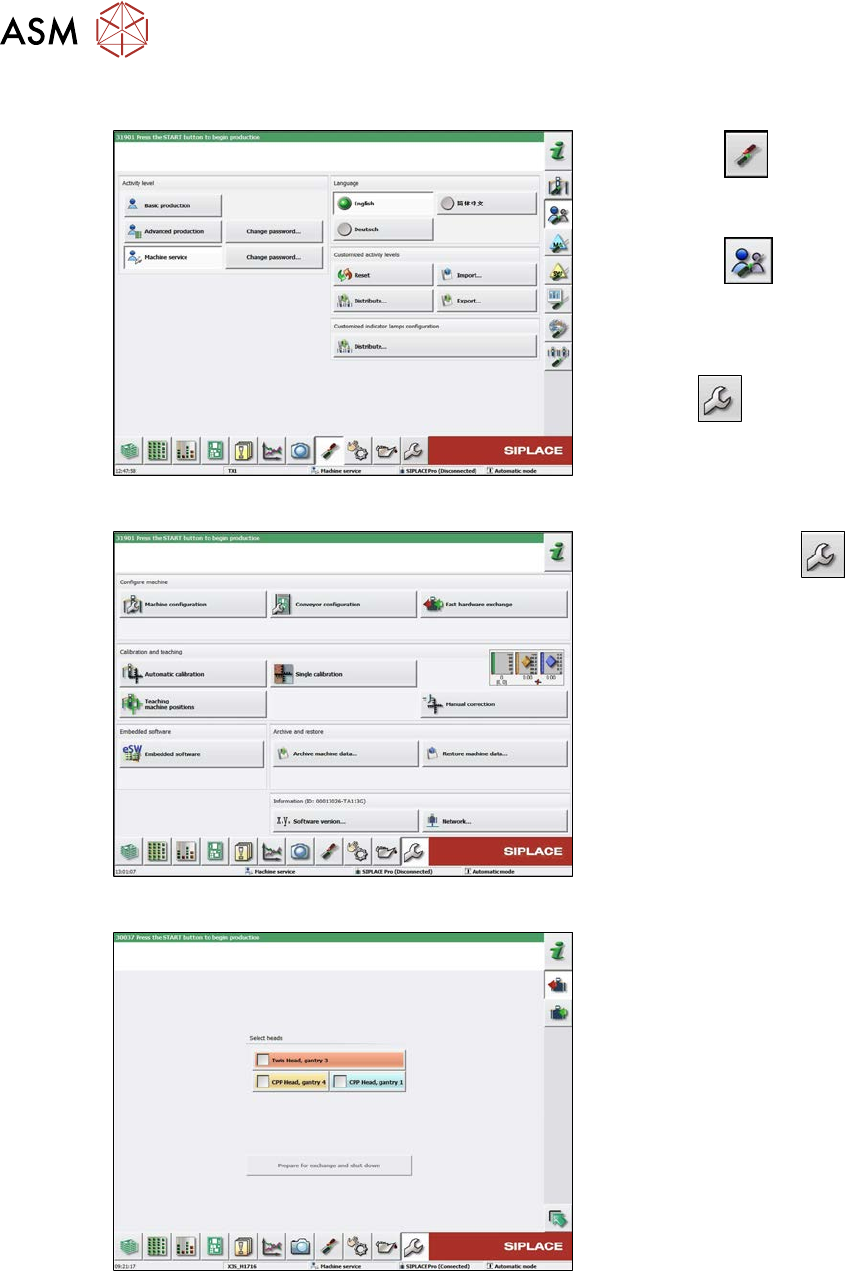 8 Head exchange 8.1 Fast Hardware Exchange 306 Service Manual SIPLACE X-Serie S 06/2019 8.1.1 Preparing the FHE in the Software Fig.389: Select operator level ► Select the button, to open the Configure, update and calib…