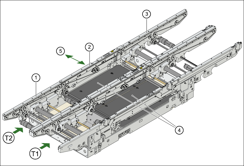 3 技術㈾料 使用手冊 SIPLACE S-27 HM 3. 1 0 模組概述- PCB 輸送帶 軟體版本 SR.503.xx 03/20 03 ㆗文版 94 3. 1 0.3 雙輸送帶 3. 1 0.3. 1構 造 3 圖 3. 1 0 - 2 PCB 輸送帶-雙輸送帶 ( 1 ) 輸入輸送帶 (2) ㆗央輸送帶 (3) 輸出輸送帶 (4) 升降平台 (5) 寬度調整 T 1 輸 送軌道 1 3 3 3 3 T2 輸送軌道 2 3 3…