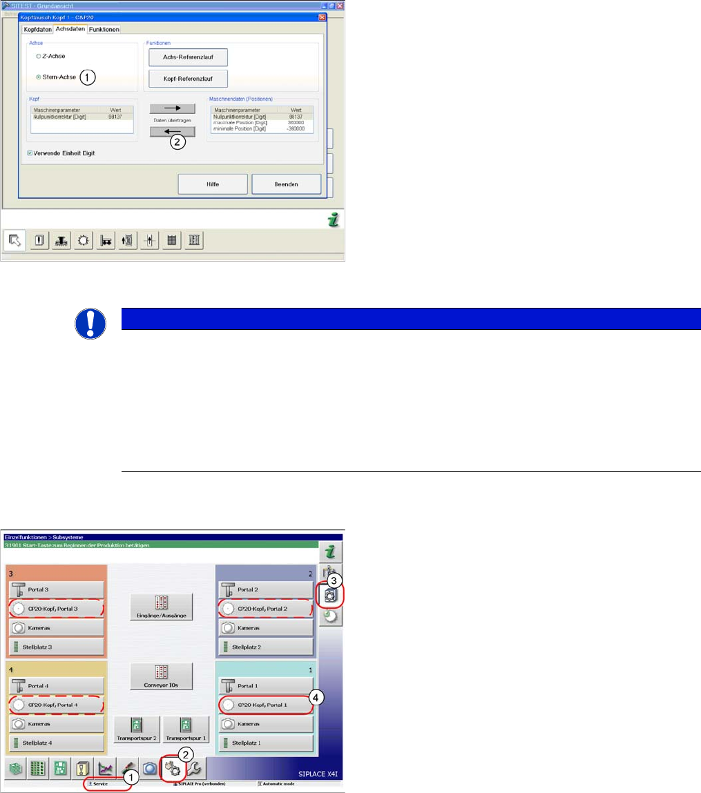 5 Einstellarbeiten 5.6 Übertragen der kopfspezifischen Date n 5.6.2 Übertragen der k opfspezifischen Daten (ab SW701) 62 Serviceanleitung SIPLACE C&P20, C&P20A, C&P20M ► Wählen Sie die Z-A c hse/Stern-Achse (…