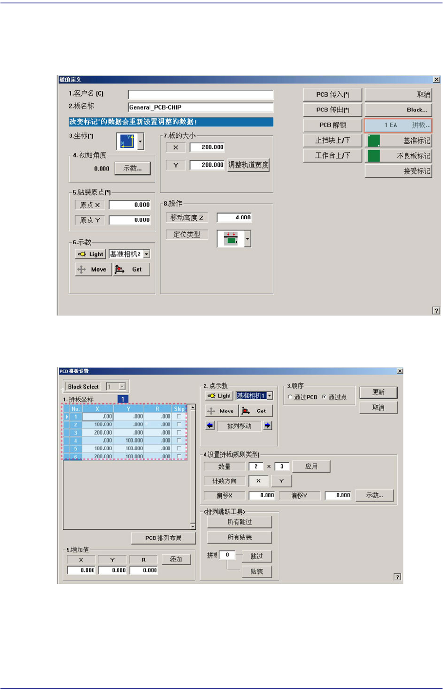设定多片PCB的每一单片对整片PCB 的”贴装原点”的偏移量。 形成跟<4. Set