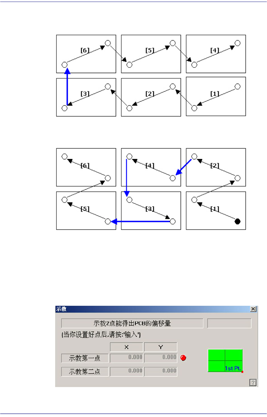 6-15 Board 定义 [Count Dir ection 选择 X 时, Fiducial T eaching 顺序 ] 1 2 3 6 5 4 [Count Dir ection 选择 Y 时, Fiducial T eaching 顺序 ] 1 2 4 3 5 6 < 偏移值 > 编辑框领域 此功能在自动设定各单片原点的偏移量时使用。 以构 成 Ar ray PCB 内部…