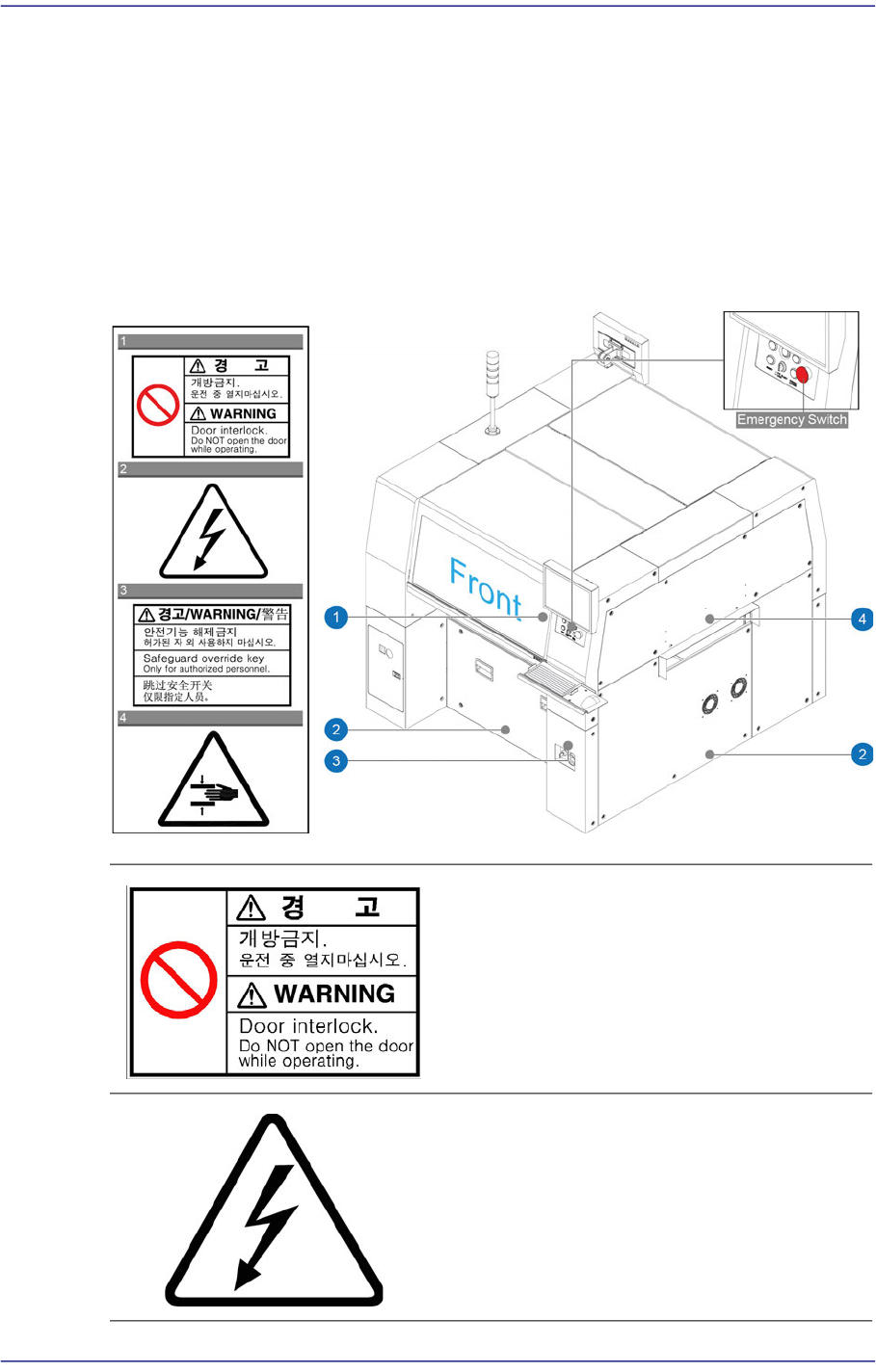 前言 iii 安全注意事項 (Safety Precaution) 以下各节的标签贴在指定的位置上。 为 了安全使用设备请遵守各标签的指示事项。 标签脱落或损伤时请参考相应图解在指定的位置上粘贴新标签。 有 关标签订购或改 善及建议事项请咨询本公司的 CS 公司或当地代理店。 设备前面 设备前面贴有以下标签 图 1.1 设备前面贴有以下标签 运行中请勿打开门 贴有此标签处有移动体, 驱动中打开门把身 体的一部份伸进设备内部时非常危险…