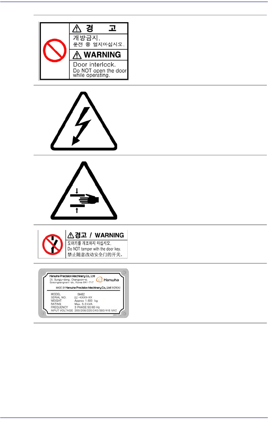 前言 v 运行中请勿打开门 贴有此标签处有移动体, 驱动中打开门把身 体的一部份伸进设备内部时非常危险。 盖内侧及周围连接物部位存在高电压要注意 电击危险。 在维护和修理设备操作时一定要先切断主电 源。 设备运行时请勿伸进手 贴有此标签处有移动体, 驱动中拆开或打开 盖把身体的一部分伸进设备内部时非常危 险。 维修前请停止设备。 为了维修设备及采取故障措施请首先停止设 备。 不要改造门钥匙。 不要擅自改造门钥匙。 否则 会危害到安全。 …