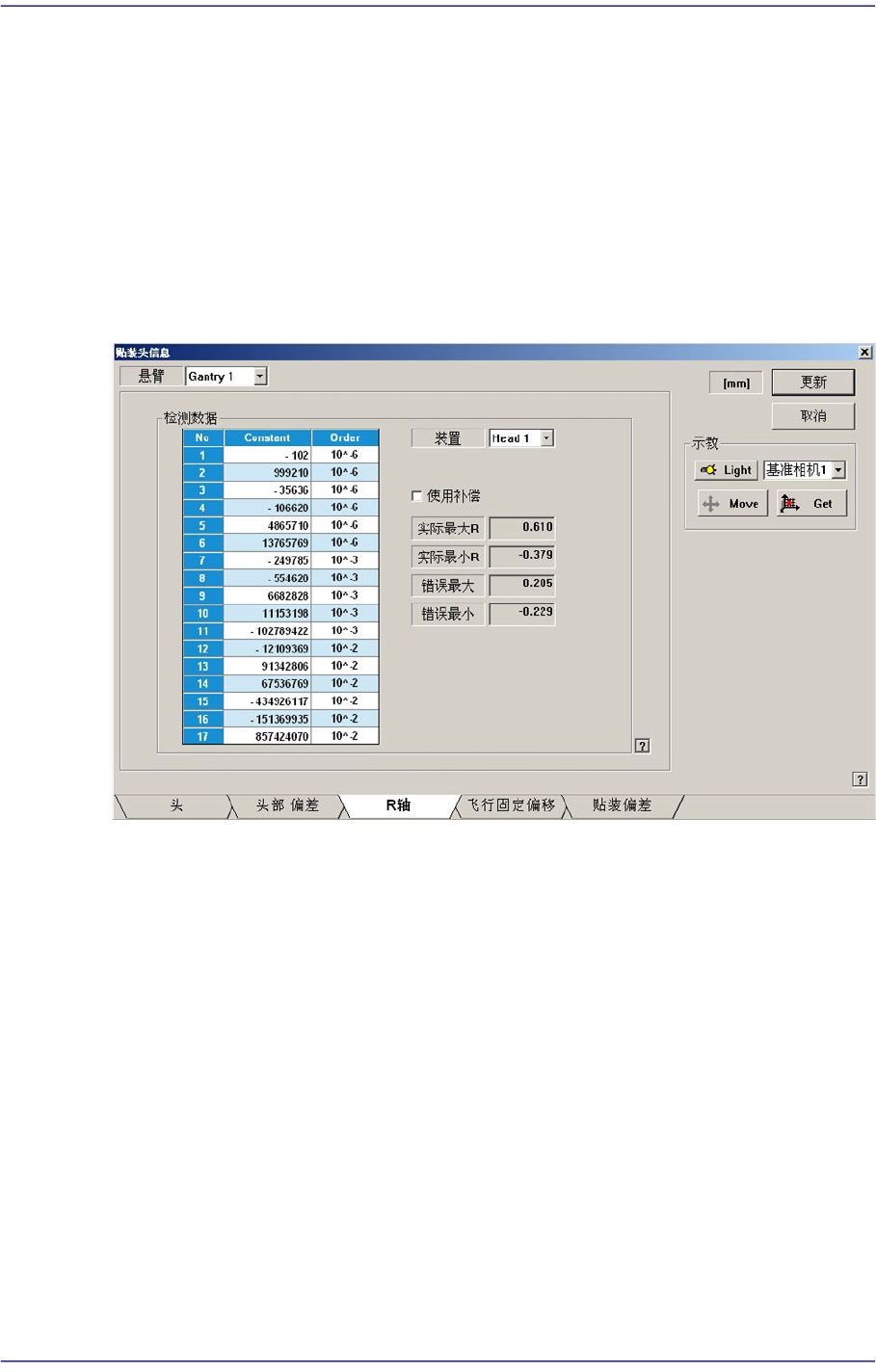 显示各磁头的R轴补偿值,或设置R轴的补偿与否。 Camera Calibration过程中执行
