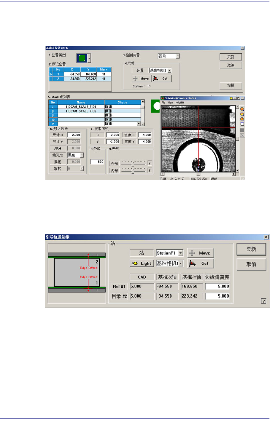 14-31 Machine Cal ibration < 基准告知 > 按钮 正确示教被选 Stati on 的各 Fiducial Mark 。 详细事项请参照 “ 6.3 基准符号 (Fiducial Mark) 设定 “ 。 < 边缘偏离度查找 ..> 按钮 正确测量 Fiducial Mar k 和 Edge 之间的 Offse 时使用。 为了测 量 Edge Of fse t 首先 要 点击 &…