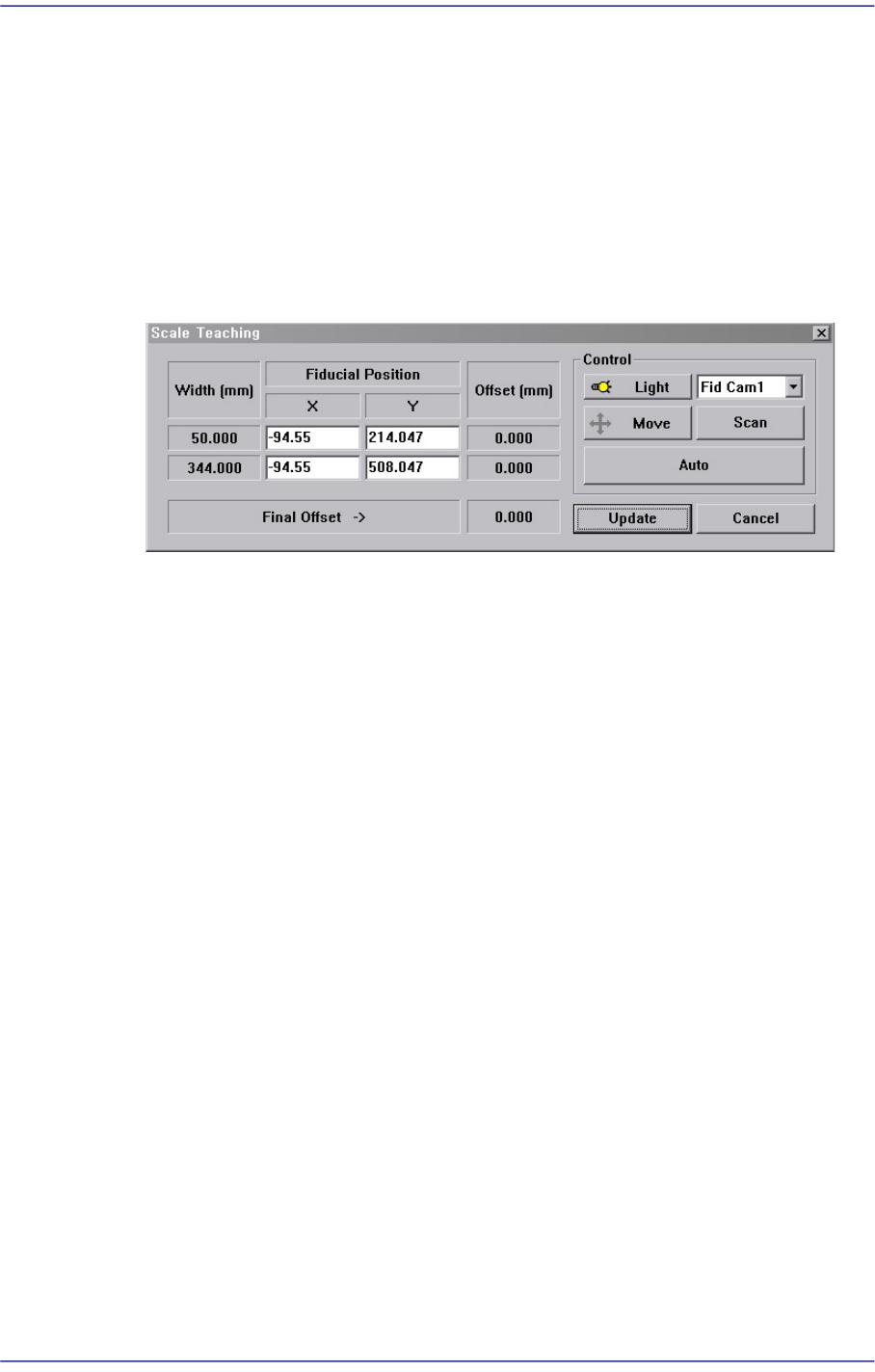 扫描 <Fiducial Position> 所选择的输送机的基准标记后,在 <Offset (mm)> 领