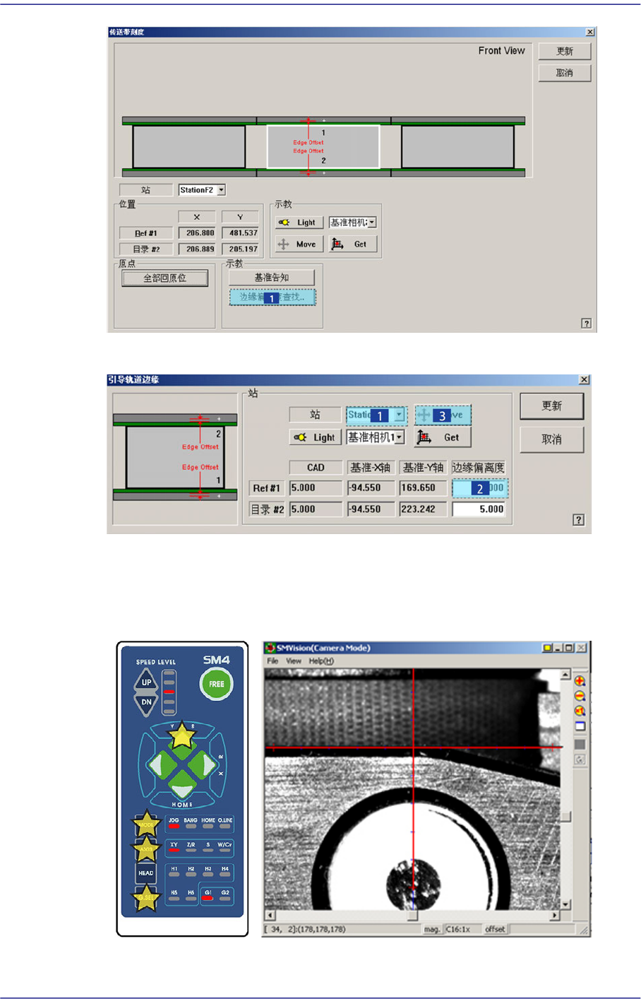 14-34 Multi-Functional Placer SM482(L) PLUS Administrator’s Guide 6. 用鼠标选择 参考点 #1 相应的 < 边偏移 > 编辑框, 点击 < 移动相 机 > 按扭。 7. 那么, 基 准 相机移动到该 Fiducial Mark 位置。 上升 Backup T able , 利用 T eachbox 点击 ’AXIS’ 按扭选择 XY , 使 V …