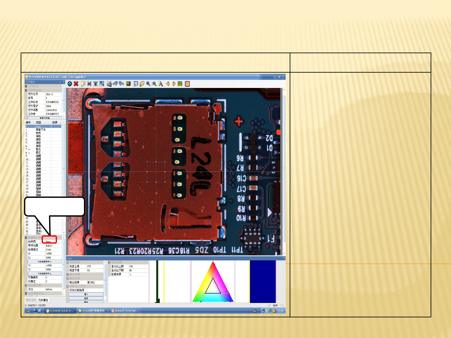 十七 . SIM 卡座类的各项参数标准 ---- 焊盘 不良 122 2. 焊盘不良的 AOI 测试图及参数讲解 焊盘不良的标准参数 1. 算法 :OCVBIN 2. 计算方法 : 截取经过亮度和颜 色处理过的 MARK 点图象或特 殊部位 图象 来确认元件焊 盘的 位子 3. 判定参数 :30-100 4. 横向 / 纵向分割一 般为 1, 反向 允许 NO 5. 输出向量 :Vector1 6. 搜索范围 : 一般大小为图内元 件周…