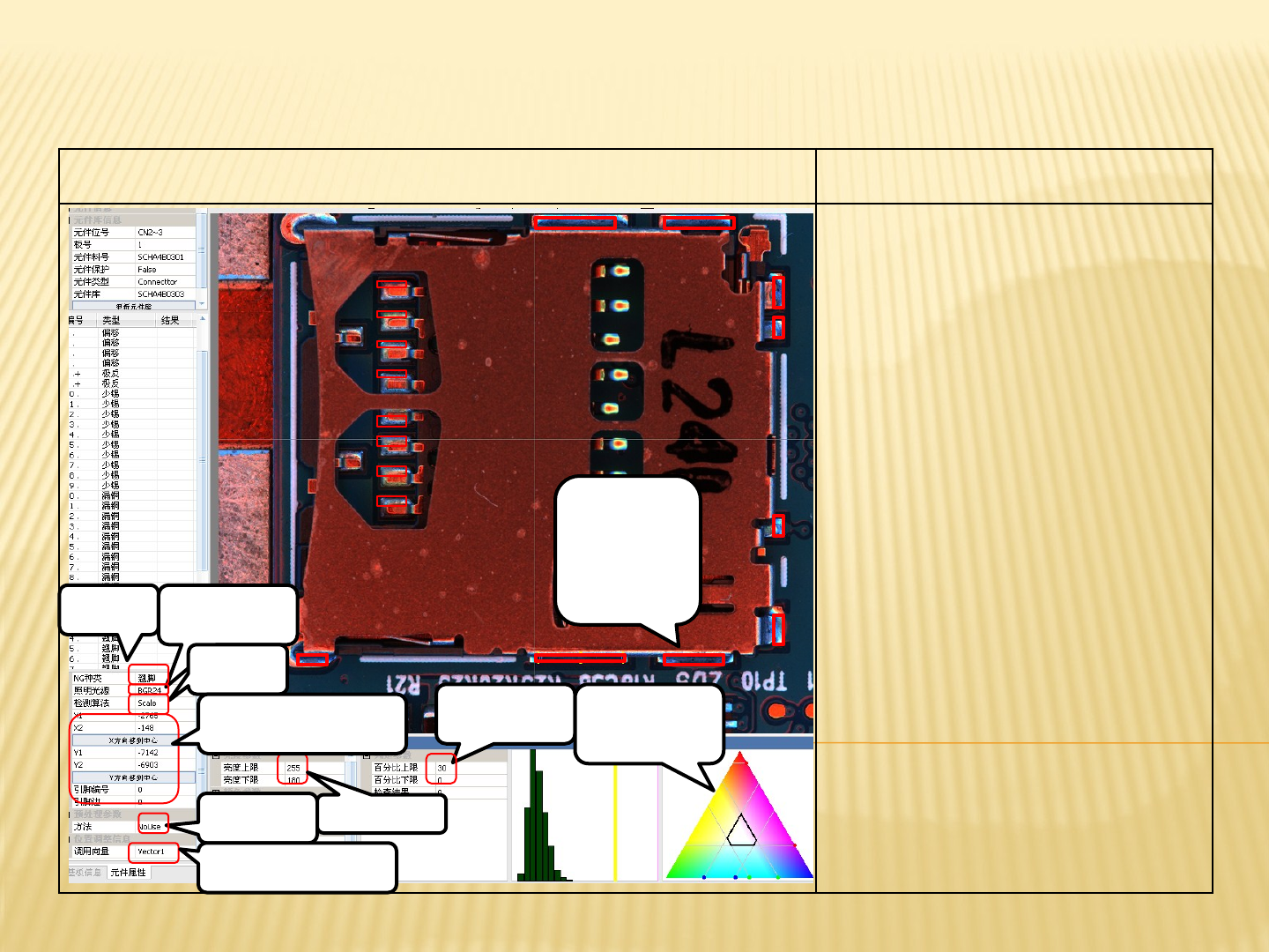 十七 . SIM 卡座类的各项参数标准 ---- 漏铜 128 9. 漏铜的 AOI 测试图及参数讲解 漏铜的标准参数 1. 算法 :Scale 2. 计算方法 : 抽取卡座四周焊盘 的颜色红 色来确认是否漏铜 3. 亮度 : 50 -255 4. 判定参数 : 0- 30 5. 调用向量 : Vecto r1 6. 搜索范围 : 一般范围在卡座周 围所有的 焊锡的部位 , 检查框 一般正好和焊锡部 位一样大小 , 如图的 所有 红色方…