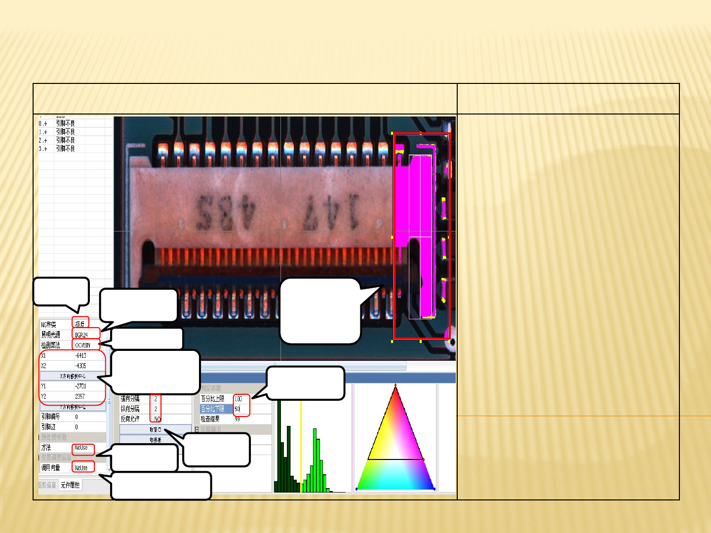 十八 . 排插类的各项参数标准 ---- 缺件 132 4. 缺件的 AOI 测试图及参数讲解 缺件的标准参数 1. 算法 :Scale 2. 计算方法 : 抽取排插本身的颜 色来确认 有无元件 3. 亮度 : 80- 255 4. 抽取颜色 : 排插本身的颜色 5. 判定参数 : 60-1 00 6. 调用向量 : Vecto r3 7. 搜索范围 : 一般大小为图内元 件内部 的两 红色方框区域 大小 NG 种类 : 缺件 照明光源…