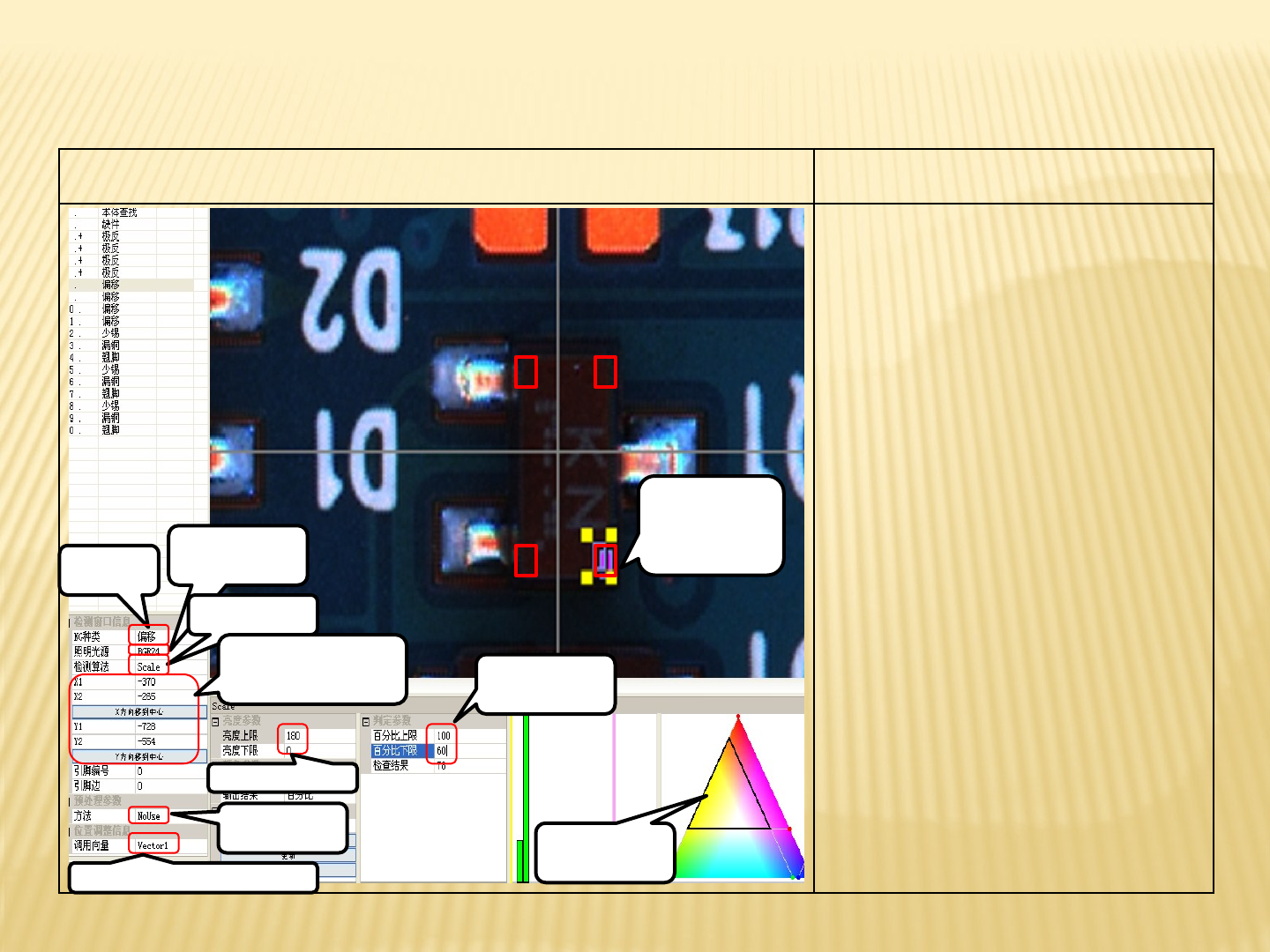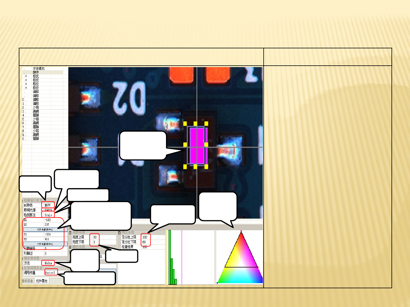 六 . 三极管类的各项参数标准 ---- 错件 46 5. 错件的 AOI 测试图及参数讲解 错件的标准参数 1. 算法 :Scale 2. 计算方法 : 取亮度和颜色处理 过字符的 图片来 做对比 3. 抽取颜色 : 字符的颜色 4. 判定参数 : 60-1 00 5. 调用向量 : Vecto r3 6. 看字符 的排列 , 因为 字符是纵 向的 2 个字符 , 所以参数为 横向分隔 :1 纵向分隔 :2 反向允许 :NO 7. 搜…