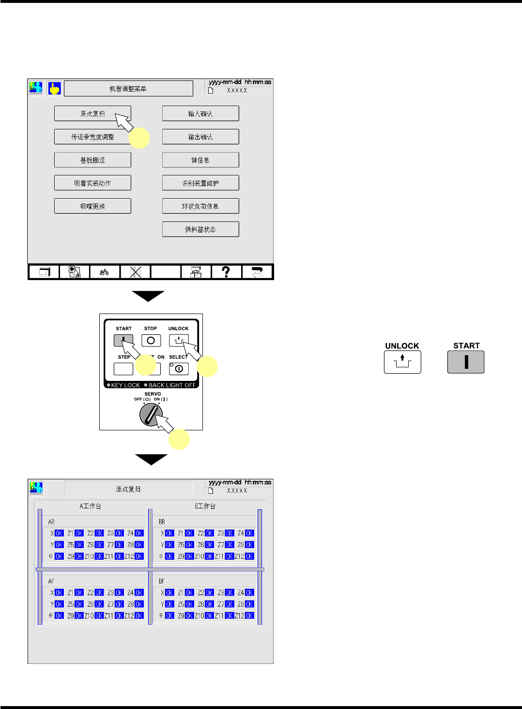 CM101-D 参考手册 2.4 机器调整 Pa ge 2- 31 2.4.1 原点复归 进行全部轴的原点复归 。 ∗ 请确认传送带上没有基 板后再进行。 1. 按 [ 原点复归 ] 。 2. 将伺服开关置于 ON ( I ) 。 ( 进行确认 ) 3. 按操作面板的 → 。 • 将开始原点复归。 • 完成原点复归后,将返 回到机器调整画面。 • 画面为高速吸头 (12 吸嘴 ) 。 (CM101 仅显示 1 工作台。 ) 2 3 3 …