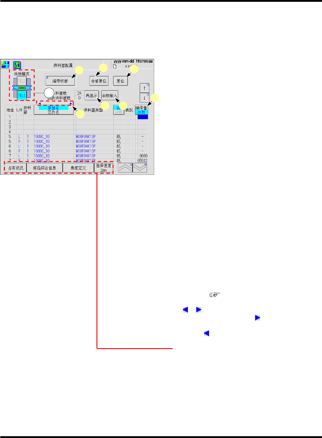 作台上的哪一供料器地址在使用中。也显示各卷盘的元件余数和压紧胶带量。