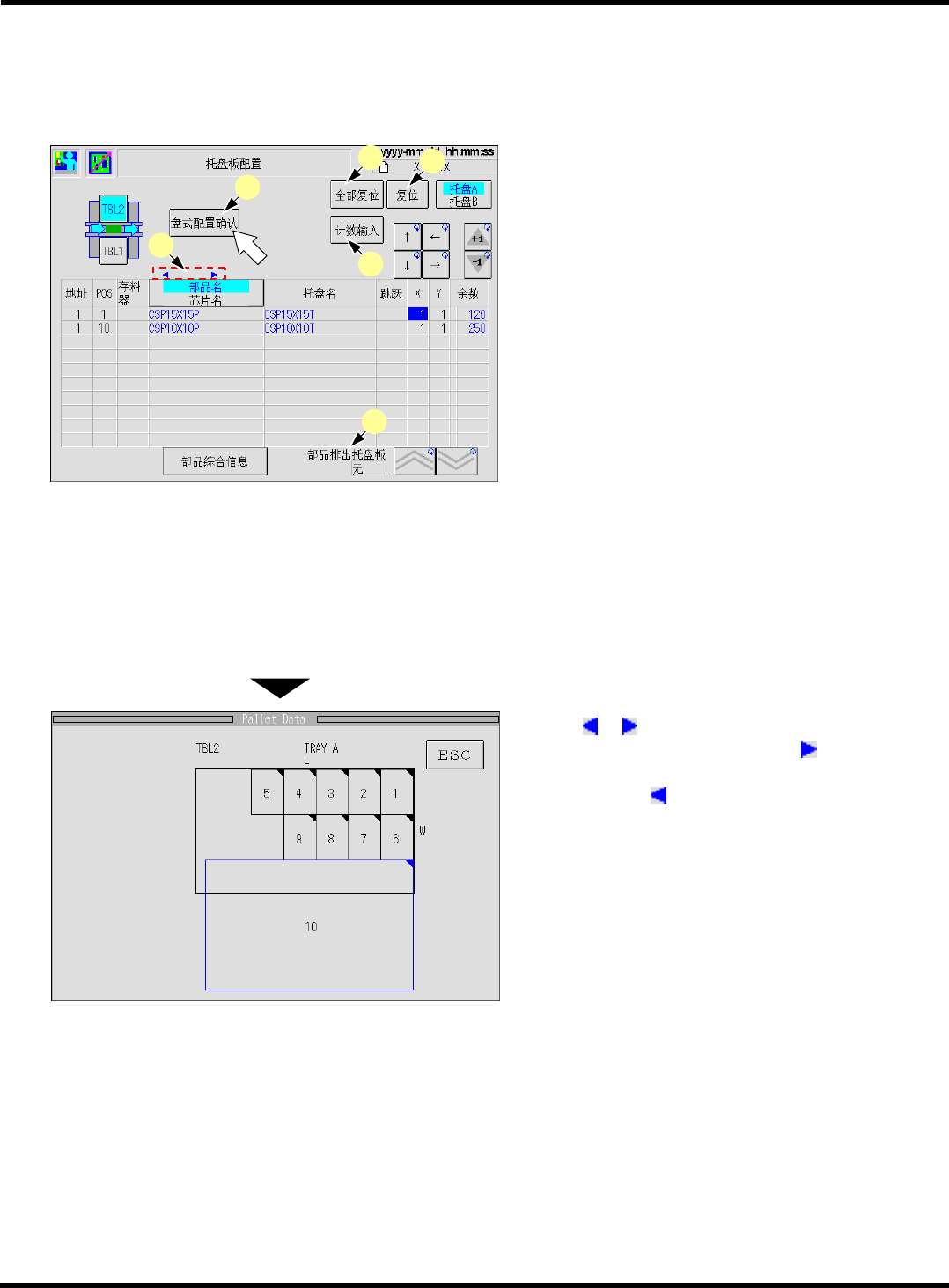 CM101-D 参考手册 2.2 生产设定 Page 2-9 2.2.2 供料器配置 ( 手放托盘 ) 通过对手放托盘的供料 器工作台的选择,可以来确 认载有哪一元件。 ∗ 但是,手放托盘不能选 择 [ 占有状况 ] 。 a. [ 盘式配置确认 ] • 显示配置托盘板的各个 板 (PO S1 ~ 10) 的位 置图像。 b. [ 全部复位 ] • 复位托盘的元件余数和 排出托盘板的元件有无 信息。 会显示确认信息,可以 时,请按 [ 是…