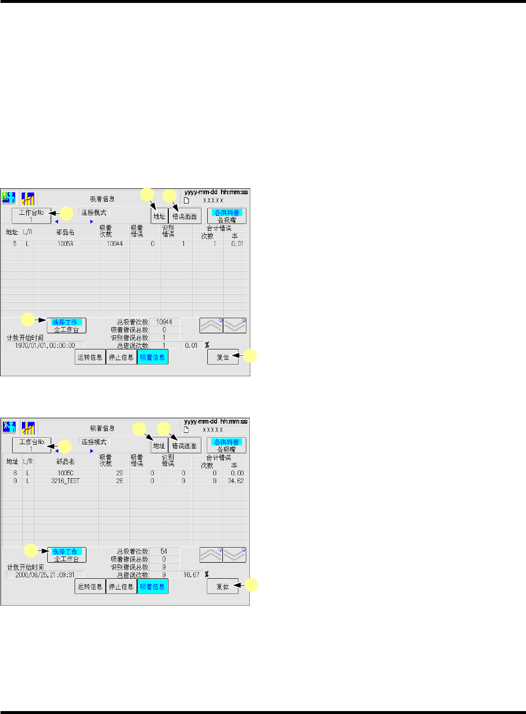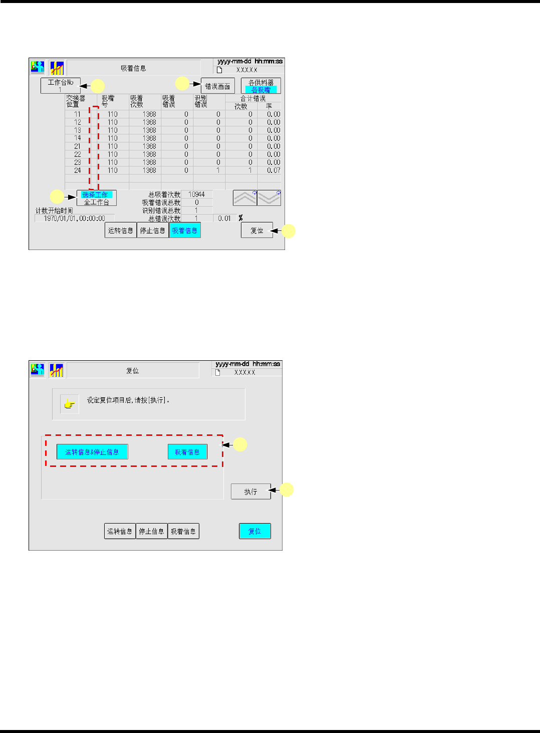 CM101-D 参考手册 2.3 生产信息 Pa ge 2- 28 2.3.3 吸着信息 吸着信息是在吸着信息 画面上, 每按一次 [ 各供料器 / 各吸嘴 ] , 切换为供 料器单位和吸嘴单位显示生 产中的元件吸着信息。 ∗ 变更生产基板时,如果 供料器地址上未被设置在供 料器上,则不显示供料器地 址的信息。 ∗ 数据与生产基板的变更 无关,只要不复位,就被计 算进去。 供料器单位 通过按 [ 各供料器 / 各吸嘴 ] 使 [ 各…