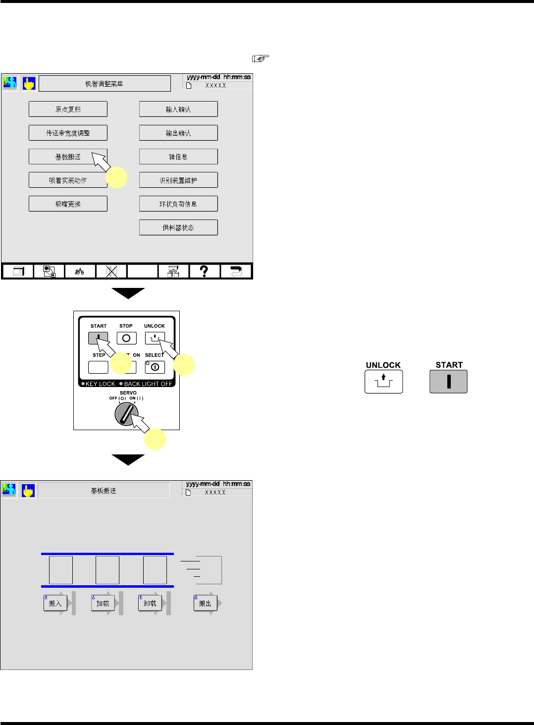 CM101-D 参考手册 2.4 机器调整 Pa ge 2- 34 2.4.3 基板搬送 进行基板搬入、往后工 序搬出的逐个工序。 ∗ 操作方法与生产设定的 基板搬送相同。 ( “2.2.6 基板搬送 ”) 1. 按 [ 基板搬送 ] 。 2. 将伺服开关置于 ON ( I ) 。 ( 进行确认 ) 3. 按操作面板的 → 。 • 原点复归已完成,不必 进行此操作。 • 会显示基板搬送的画面 。 EJM5B -Ma-0001 2 3 3…