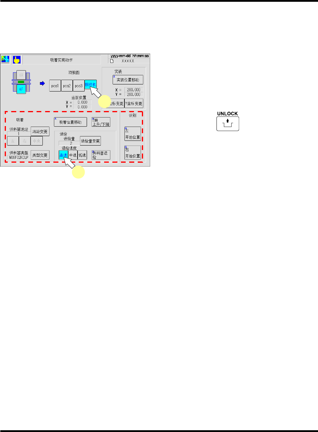 CM101-D 参考手册 2.4 机器调整 Pa ge 2- 37  吸着实装动作的画面详情 • 画面为高速吸头 (12 吸嘴 ) 。 画面上的按钮配置虽有 所不同,但是所显示的 项目内容是相同的。 项目 说明 a [ 吸着位置移动 ] 使吸头或照相机移动到 所选择的供料器的吸着位置 。 b [Z 轴 上升 / 下降 ] 在吸着位置上使吸头下 降或上升。 c [ 供料器进给 ] 按所指定的进给量 ( 间距 ) 进给编带。 d [ 进给…