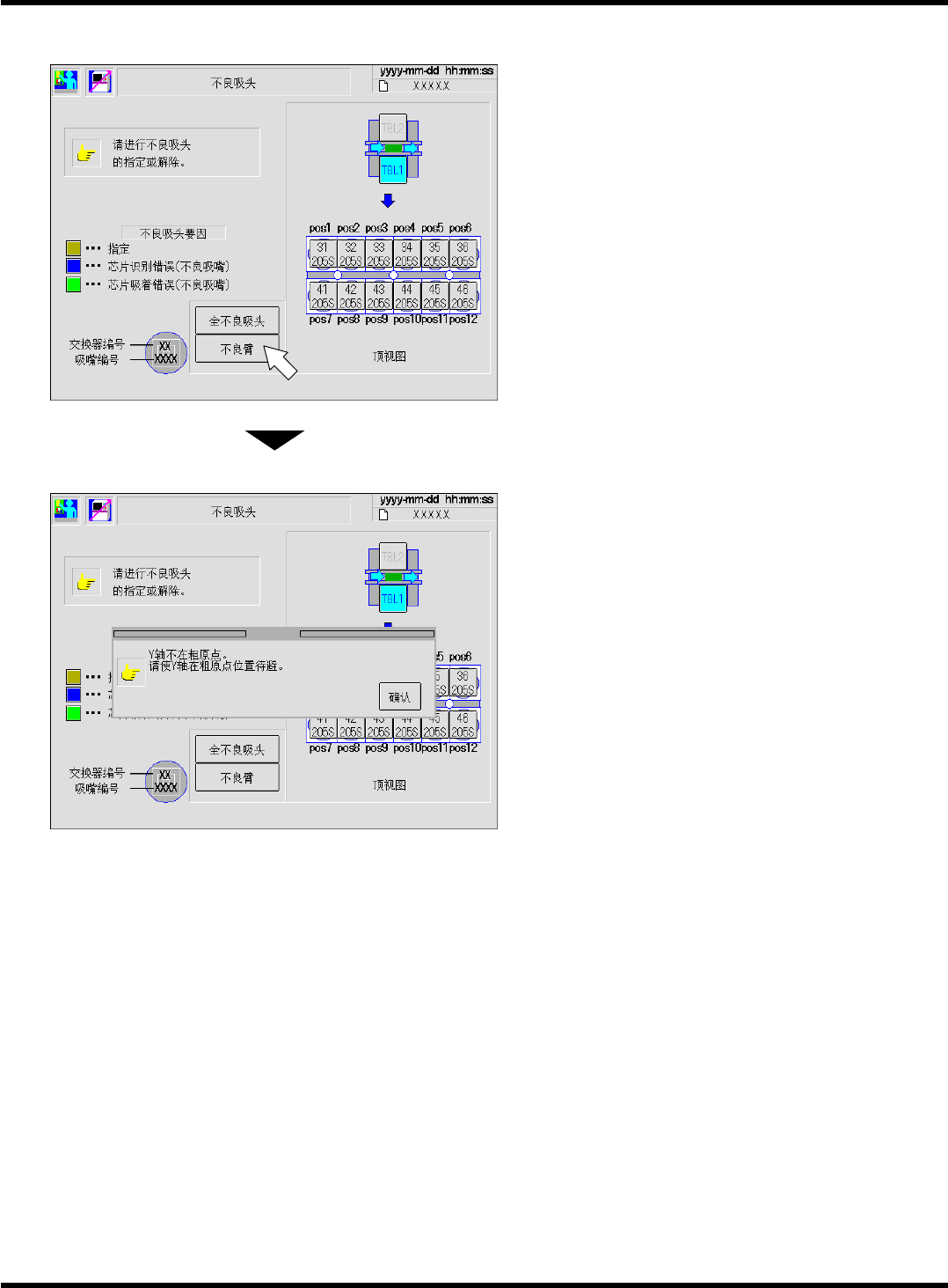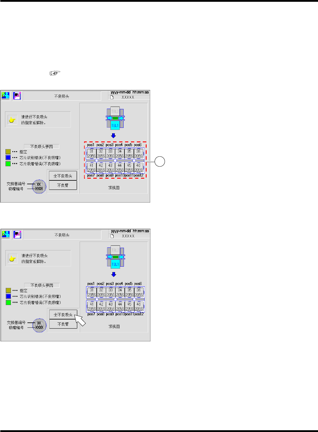 不良吸嘴不进行生产。确认后要解除时,按想解除的吸嘴的按钮。按钮恢复到正常颜色