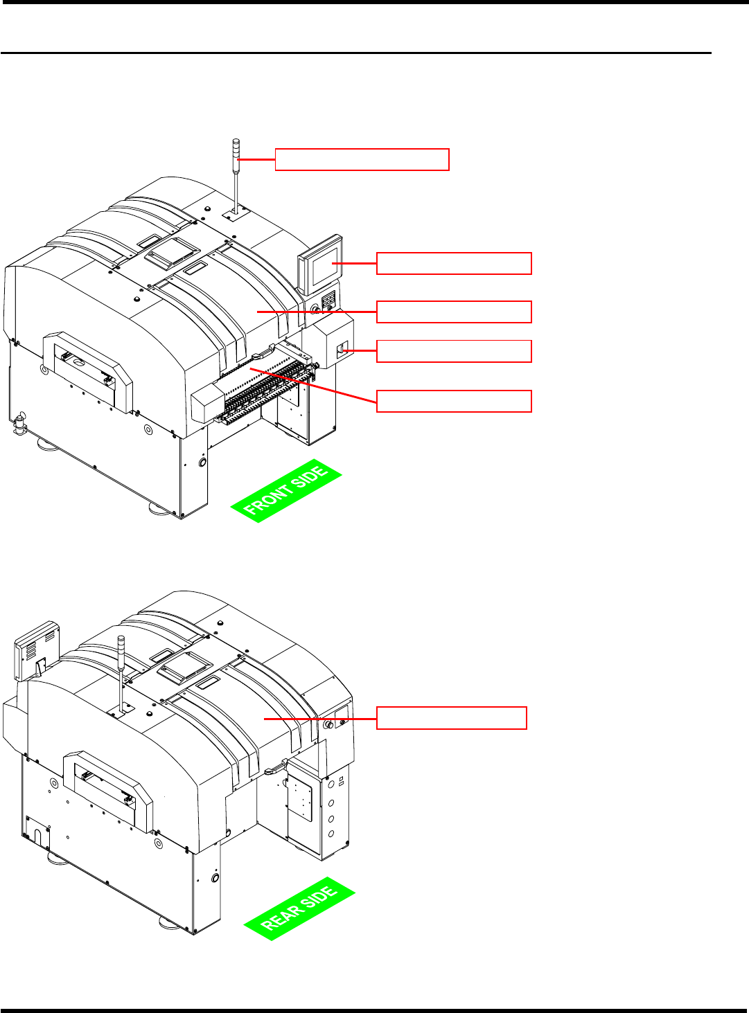 CM101-D 参考手册 1.1 各部的名称和功能 Page 1-2 1. 1.1 各部的名称和功能 1.1.1 外观图 1. 正视图 2. 后视图 EJM5B-A B 后盖 EJM5B-A A 状况显示灯 (3 段信号塔 ) 电源开关 前面彩色接触面板 供料器工作台 前盖 EJM5B-C-RMC0 1-A01-00