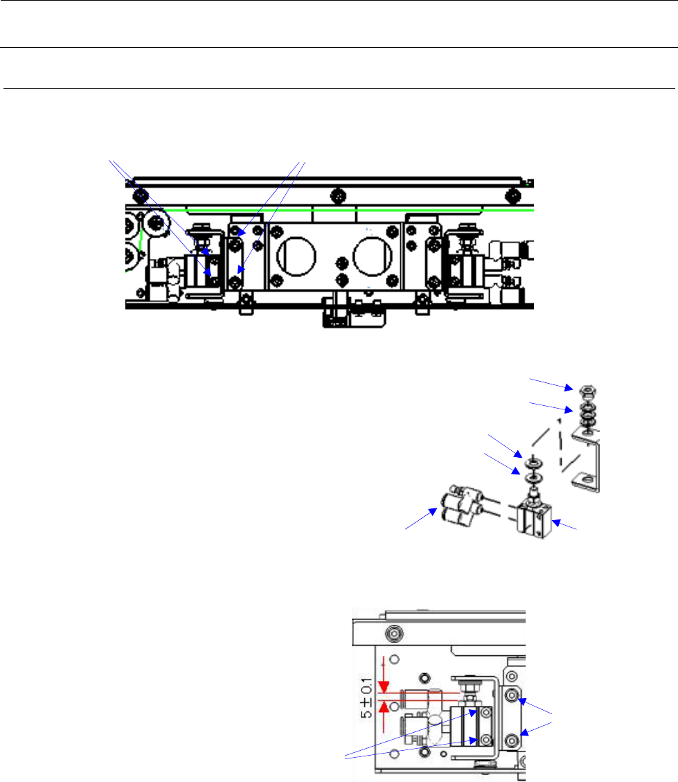维修调整要领书 5-16 6) 请将夹紧杆⑨向上提,在③气缸与⑩托架之间【 A 】没有空隙的状态下进行调整, 使基板导轨安装面 【 B 】与夹紧杆上面的尺寸为 9.2±0.2mm ,拧紧②螺丝。 注)这时,请确认反面一侧的气缸与托架之间没有空隙。 注)规格值:如果不能调整到 9.2±0.2mm 以内,请将反面一侧的②螺丝松开,调整夹紧杆的位置。 7) ③气缸与⑩托架之间的空隙【 C 】为( t0.6mm )时,请调整 ⑫ 止 动卡具,使…