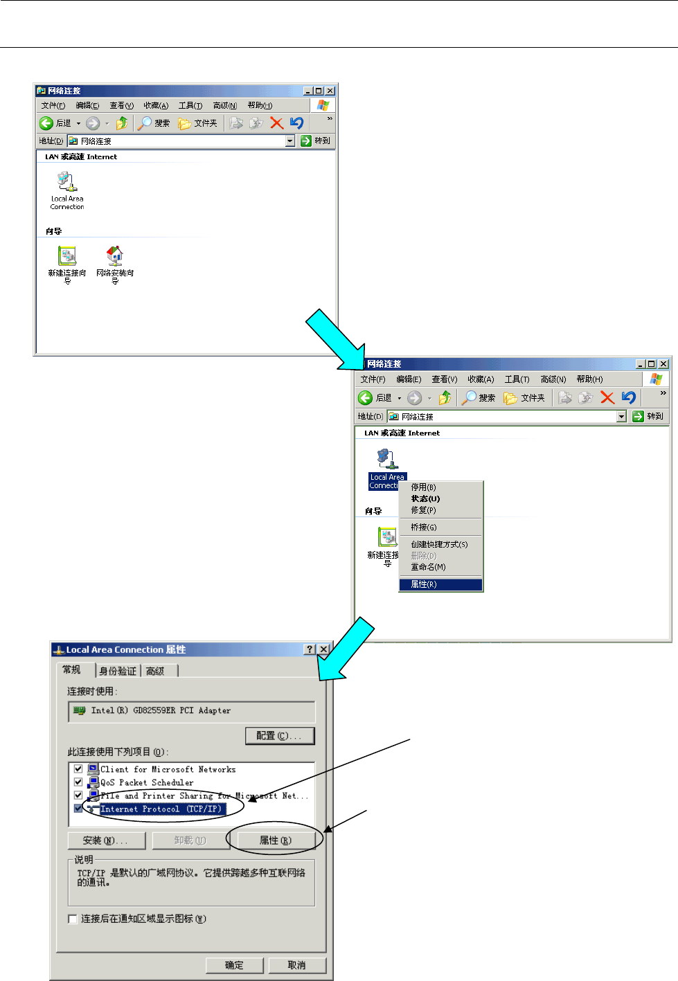 维修调整要领书 12-28 3 ) 于是显示 [ 网络连接 ] 对话框。 4 ) 请选择 3 )的对话框内的 [Local Area Connection] 图标, 单击鼠标右键, 选择 [ 属性 ] 。 5 ) 于是显示 [[Local Area Connection 的属性 ] 对话框。 在这一画面中, 请选择 ① [Internet Protocol ( TCP/IP ) ] ,再 按 ② [ 属性 ( R ) ] 键。 ① ②