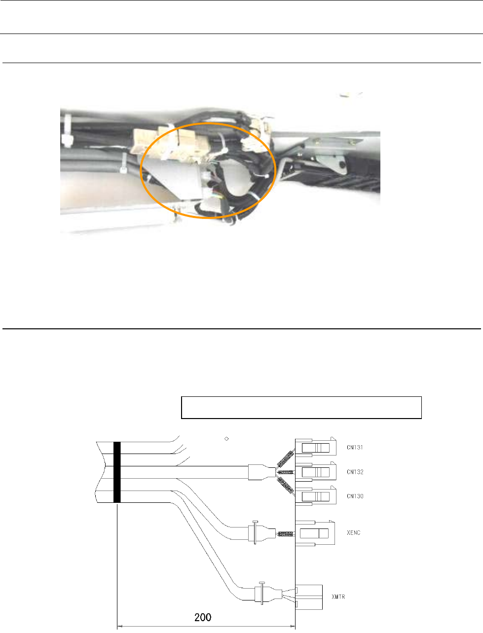 5) 调整线束,使 2 条记号的中间位置成为 X 电缆拖链的端部,再予固定。