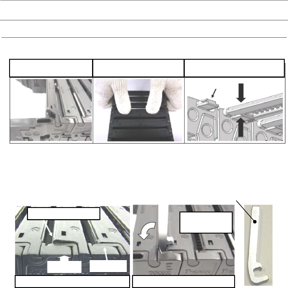 维修调整要领书 1-34 1-7-5 链板 ・ 支撑板的安装 按下述操作顺序将链板 ・ 支撑板装到链板键上。 1) 将链板的轴插入链板键。 2) 在距链板两端20mm左右处用两 手按入安装 。 3) 用手指夹住链板键的键舌部和链板, 使嵌入 。 注1) 请务必要确认链板是否已确实嵌入链板键的键舌部。 如安装得不正确,运行中链板可能脱落。 键舌部 从上下夹住 ※ 当链板未正确安装时,会像照片①所示那样端部处于浮起状态,故使用前请务必要检查…