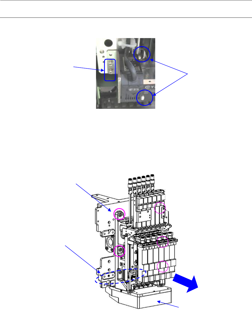 11) 请用手按住贴装头,同时拆下 M5×20 带垫片螺丝(6 个),向身前平行移动取出,注意不要碰