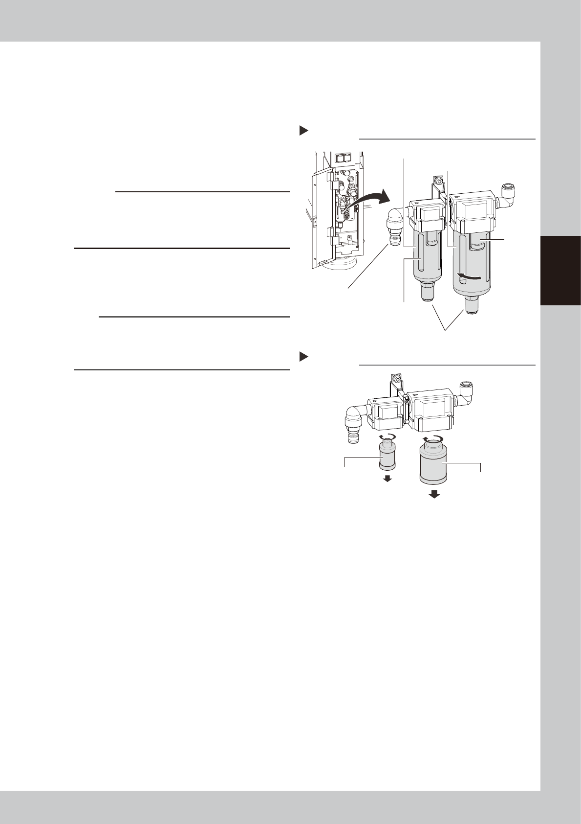 3-67 3 Periodic maintenance items 5.4.2 Cleaning the air and mist filters and cups An air filter and an oil mist filter are installed at the air supply fitting of the machine to prev ent oil, water , and impurities in th…