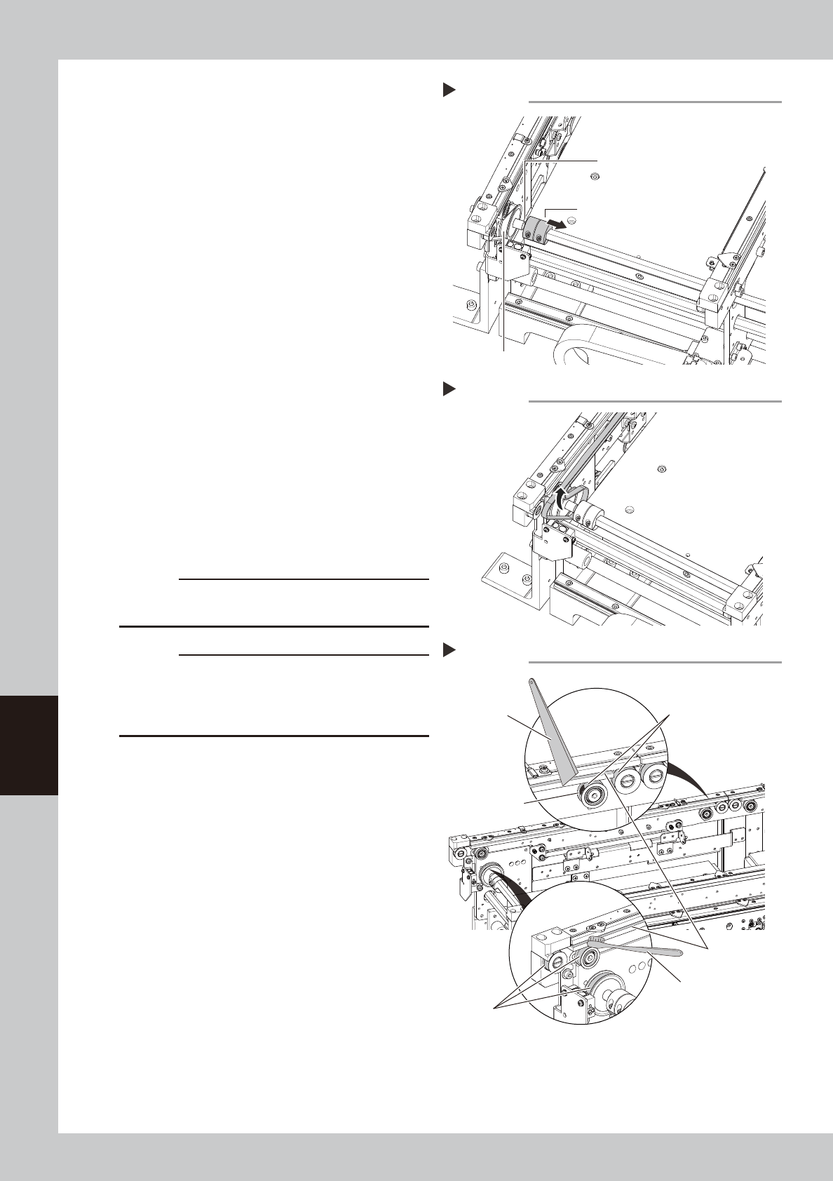 6-7 6 How to replace consumable parts 8 Reattach the belt. 1. T emporarily place the belt on the belt tensioner pulley. 2. Place the belt on the end pulley detached in Step 4 and mount it with the pulley shaft together w…