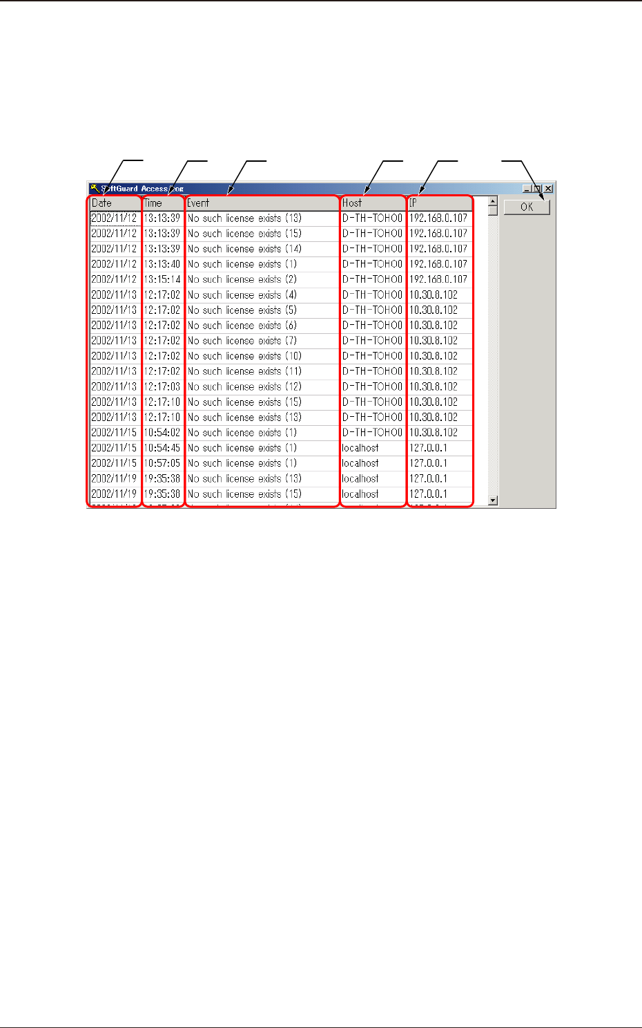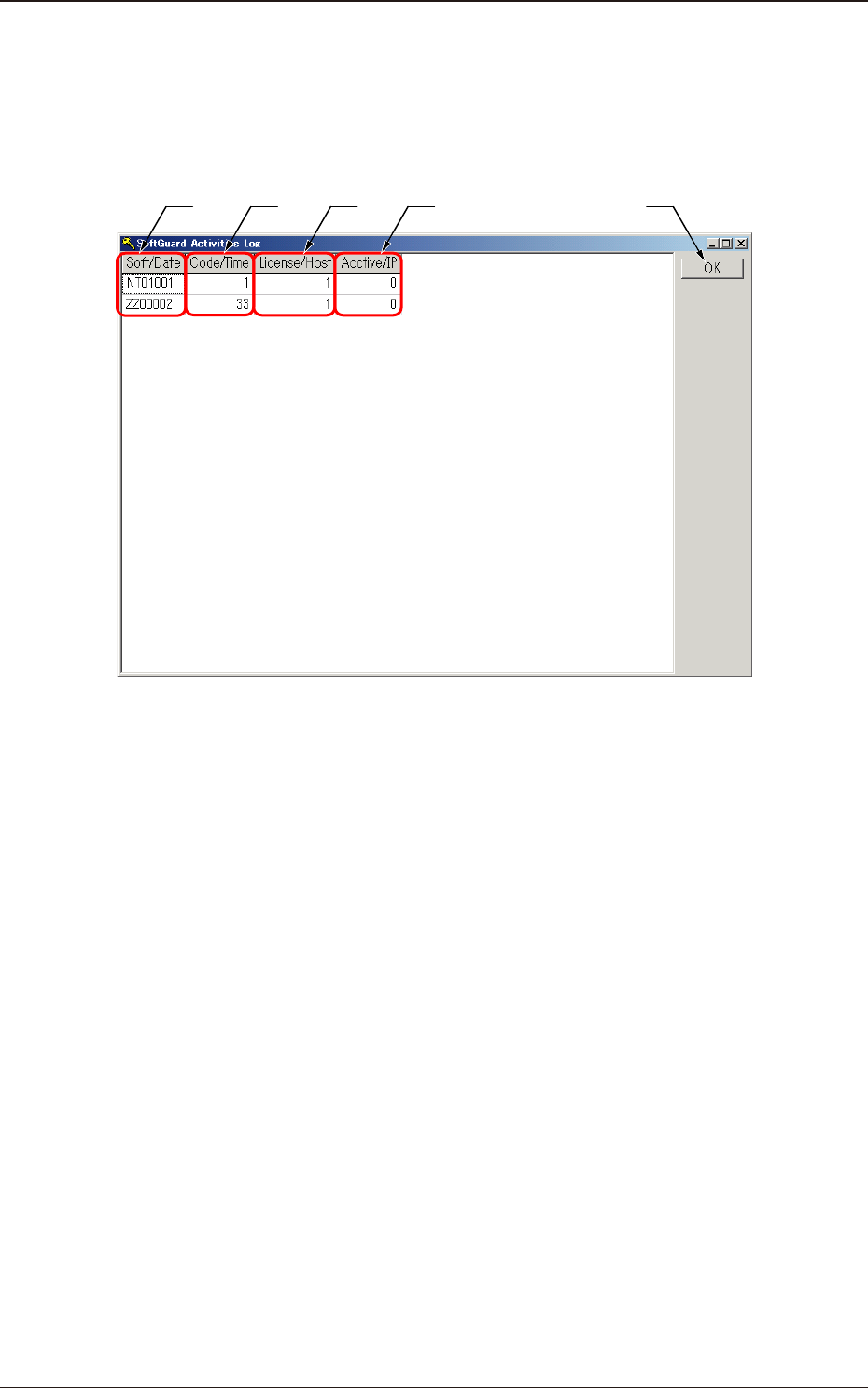 Tg1 109-ID-SO 18 3.8ライセンスサーバの設定 0807-002 アクセスログ “SoftGuard Access Log”画面では、ライセンスサーバへのアクセス を確認することができます。 “SoftGuard Server Setter”画面で [Access] ボタンを押します。 “SoftGuard Access Log”画面が表示されます。 [1] [2] [3] [4] [5] [6] Fig. 13 [1…