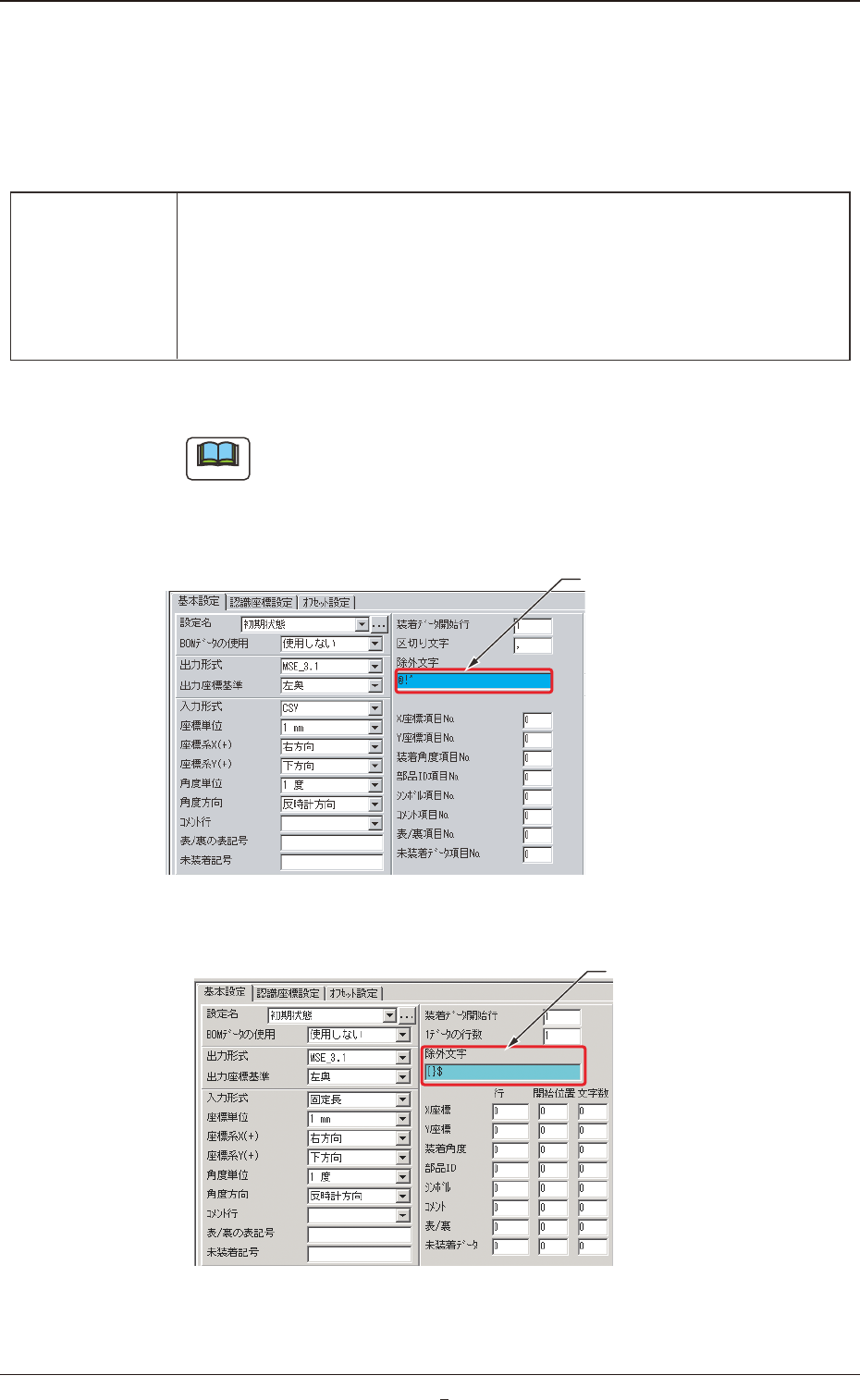 31-1 Tg1 109-ID-SO 1005-003 5.4基本設定 (17) 除外文字 CAD データをマスターデータに変換する際に、登録した文字を無 視します。 除外文字は複数登録可能で、Fig.22-1 で示す文字が設定可能で す。 設定可能文字 アルファベット ( 大文字、小文字 ) 数字 その他 (*1) (*1) !”#$%&’()-^\¯|[]{}@~;:+*,.<>/?_ 52 種類 10 種類…