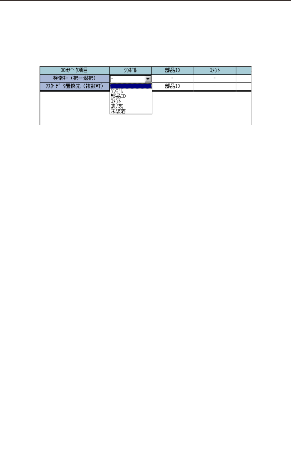 36-2 Tg1 109-ID-SO 0603-001 5.7BOM データの設定 [3] BOM データ置換え設定部 取得した BOM データをマスターデータのどの項目に置換えする かを設定します。 マウスで左クリックをすると、マスターデータの項目がコンボ ボックスで表示するので、設定したい項目を選択してください。 Fig. 23-5 [4] 取得 BOM データの表示部 BOM フ ァ イ ル フ ォ ー マ ッ ト 設定 を…