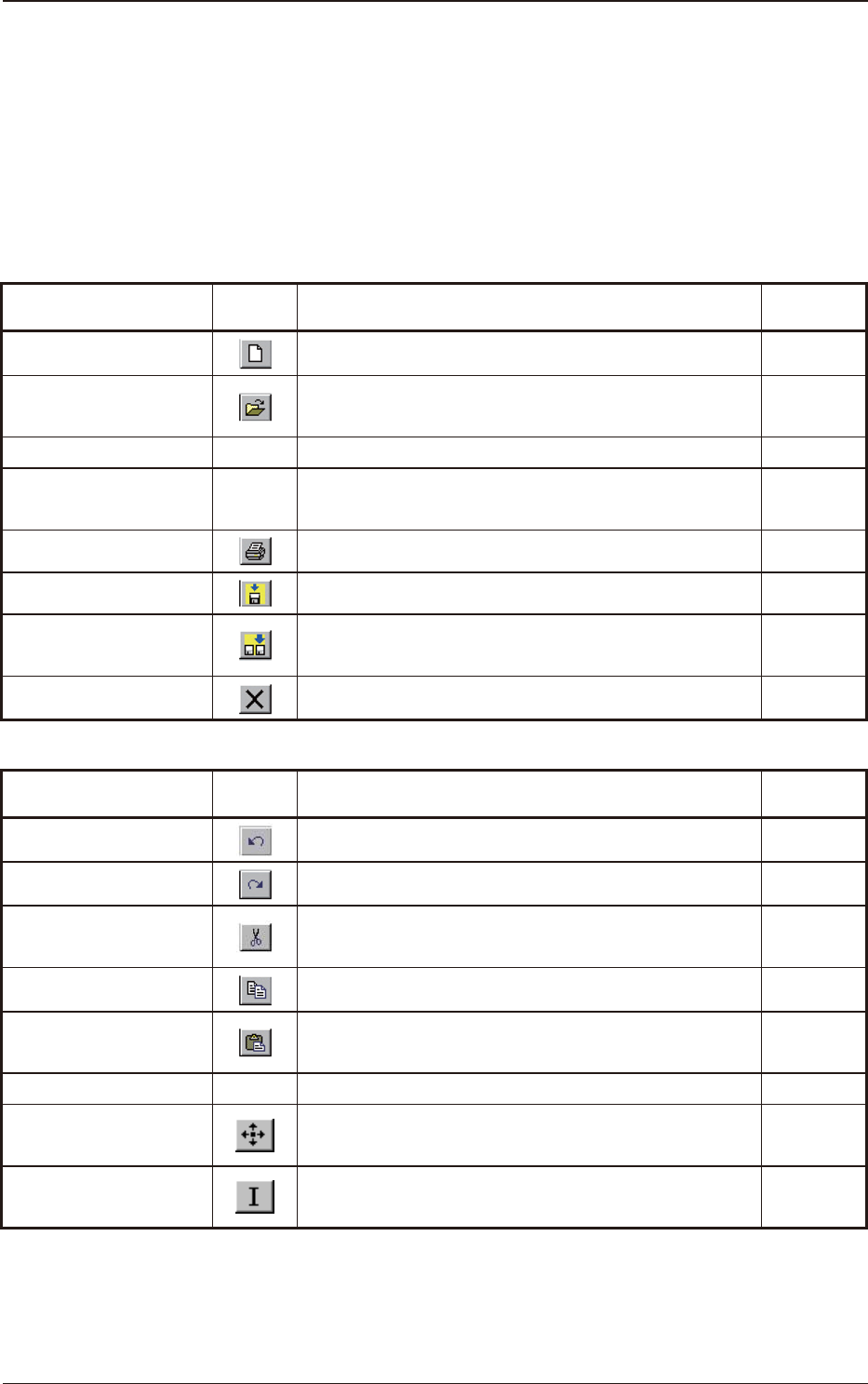 57 Tg1 109-ID-SO 13.2メニューバーとツールバー 1009-007 13.2 メニューバーとツールバー マスターデータ編集ソフトで使用するメニューとツールバーを説明 します。 コンテキストメニューの欄に○のある機能は、編集画面で右クリッ クすると表示されるコンテキストメニューからも呼び出せる機能で す。 < ファイル (F)> Table9 メニュー アイコン 機能 コンテキスト メニュー 新規…