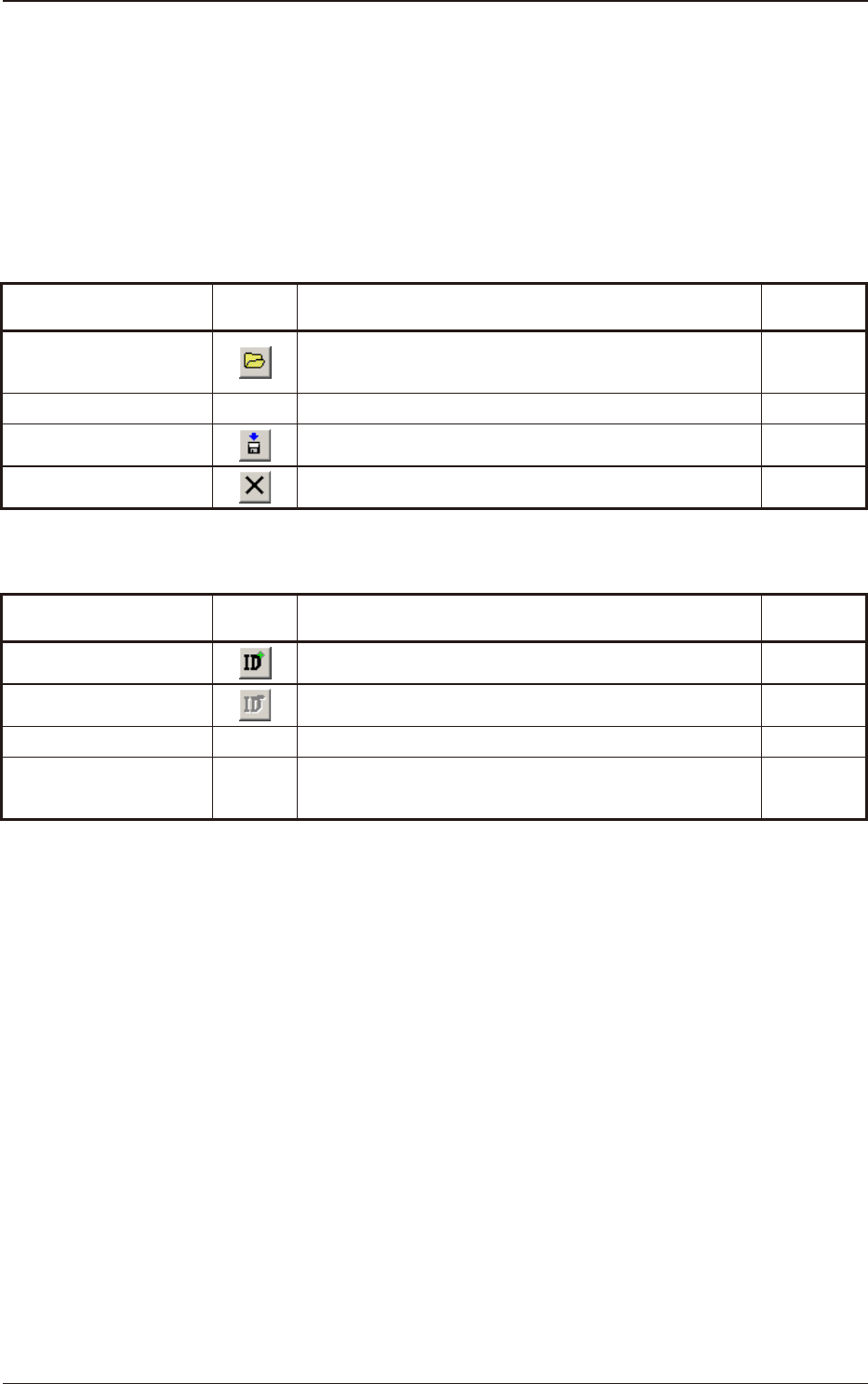 48 Tg1 109-ID-SO 12.3メニューとツールバー 1009-007 12.3 メニューとツールバー 未装着部品 ID データ編集ソフトで使用するメニューとツールバーを 説明します。 コンテキストメニューの欄に○のある機能は、部品 ID 一覧画面で右 クリックすると表示されるコンテキストメニューからも呼び出せる 機能です。 < ファイル (F)> Table20 メニュー アイコン 機能 コンテキスト…