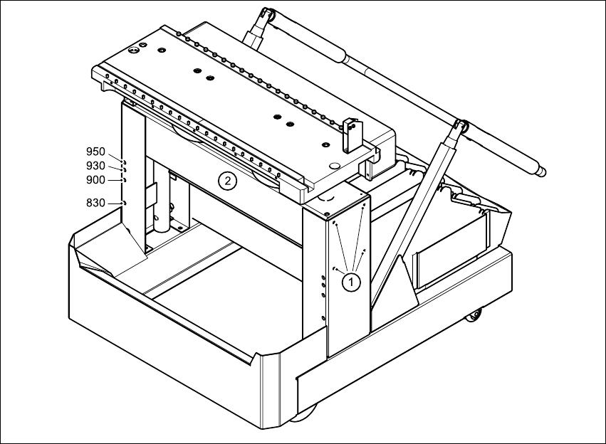(2) Holes in the cross-beam for adjusting the table height to 830, 900, 930 and 950 mm
