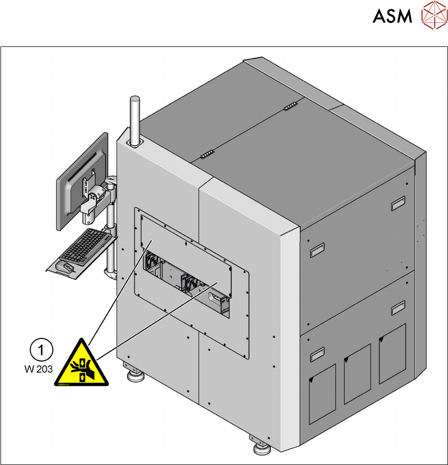 2 安全 2.2 警告标签 22 用户手册 ASM ProcessLens Dual-lane 06/2018 2.2.1 设备上的警告标签 图4: 警告标签正视图 1 W 201 [03009338-xx] 2 W 202 [03009341-xx] 3 外部接地点 [00359574-xx] 4 W 204 [03009343-xx] 5 W 二级激光 [03134118-xx] 6 W 81-00382 [03112319-xx…