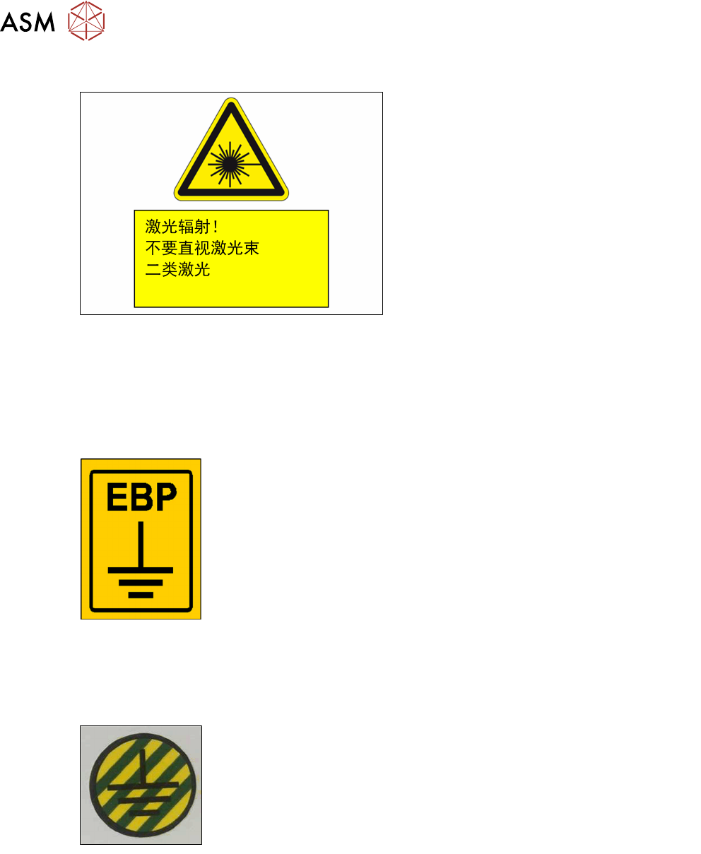 2 安全 2.2 警告标签 32 用户手册 ASM ProcessLens Dual-lane 06/2018 2.2.3.14 警告标签 - 激光辐射 图23: W 二级激光 [03134118-xx] 激光辐射 二级激光 符合 IEC 60825-1:2014 标准 ► 不要直视激光束! 见图 "警告标签正视图" [ } 22] 2.2.4 其他标签 2.2.4.1 标签 - 外部接地点 外部接地点 请遵守第…