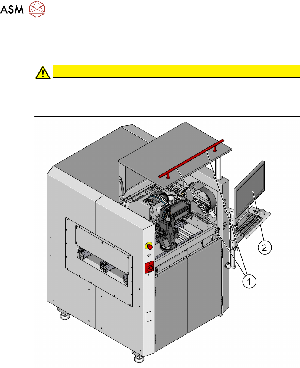 2 安全 2.4 操作设备时的安全须知 用户手册 ASM ProcessLens Dual-lane 06/2018 35 2.4.2 将印制板插入到输入和输出传送导轨中 警告 将印制板插入输入传送导轨中时有手部受伤的危险 将基板手动插入输入传送导轨时,手部可能会被悬臂夹住,因此可能会因进入悬臂危险区域 而导致人身伤害。 设备的运营公司将负责保证输入和输出传送导轨都已被盖好,从而避免任何人将手部和胳膊 伸到这个区域内。 以上注意事项同样…