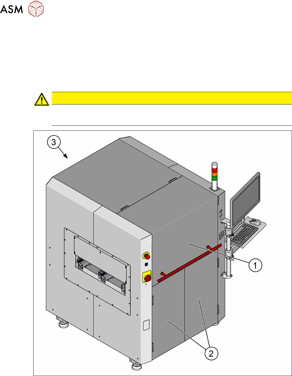 所有移动部件用一个可以移动的前保护罩 (1) 进行防护。保护罩 (1)、前安全门 (2) 和后保护盖 (3) 作