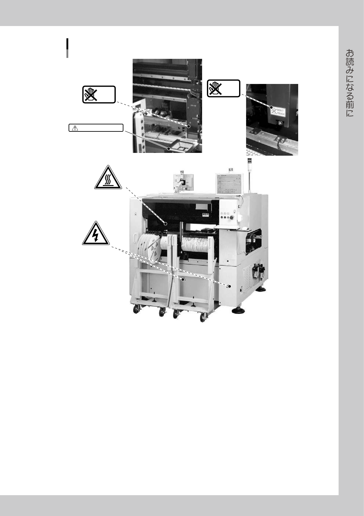 xi 警告表示ラベル貼り付け場所 本体背面 ■ 背面下パネル部 ■ 機械内部モーター部 DON'T TOUCH ■ フィデューシャルカメラ カバー内部 DON'T TOUCH ■ サイドビューカメラ (オプション) ■ マルチカメラ DO NOT TOUCH 51 0 01 - F9 -0 0