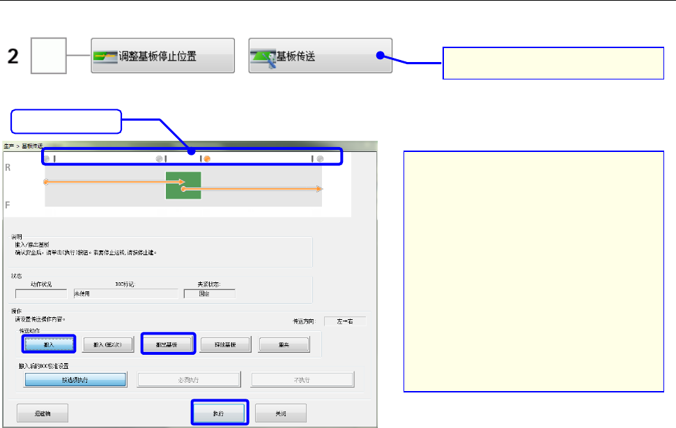 操作手册 I 3- 12 Step5 - 2 在基板搬送画面 上执行基板 搬入。 请确认是否保持 与生产时的动作 同步传送 基板,传送动作 是否有问题。 2 . 把基板安装在 IN 端的基板检测 传 感器反映位置上 。 ①确认搬入 选择 [ 搬入 ]-[ 执行 ] 后, 基板即可搬 入。 ②确认搬出 选择「搬出基板 」 - 「执行」 后,基 板即 可搬出 。 1. 按下「基板搬 送」按钮 。 基板检出 传感器 ① ②