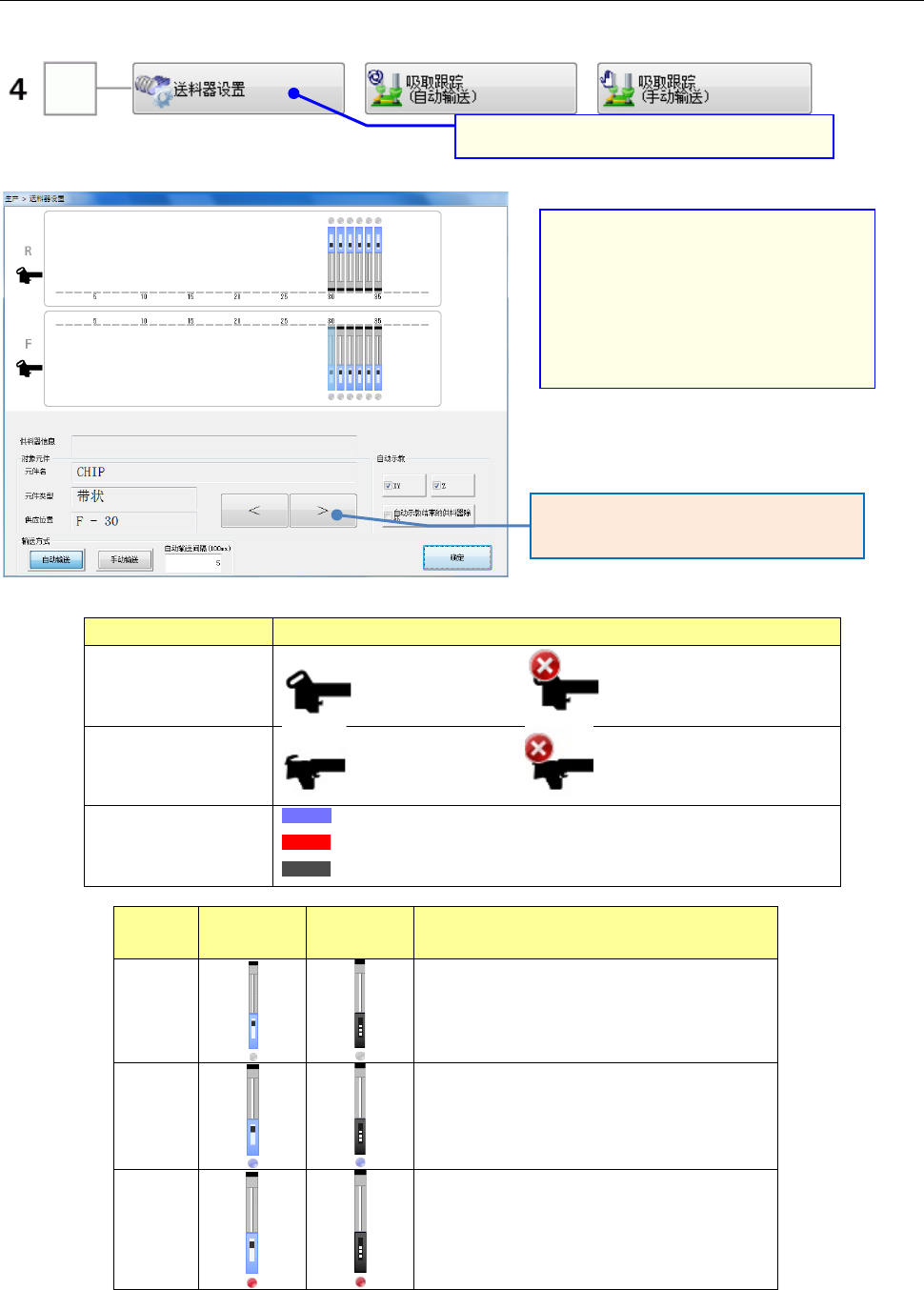 操作手册 I 3- 16 Step5 - 4 执行送料器设置 。 把送料器安装在 规定的位置之后 , 执行「吸取跟 踪(吸 取位置校 正) 」 。 元件的安装方法 ,有关向台架安 装送料器 问题,请参见各 元件供应装置 的说明书。 项目 内容 送料器台架状态 连接中(可跟踪) 未连接(不可跟踪) 送料器台架状态 (RF) 连接中(可跟踪) 未连接(不可跟踪) 电动送料器状态 : 生产使用送料器(在生产中可使用) : 错误送料器(送料器类…