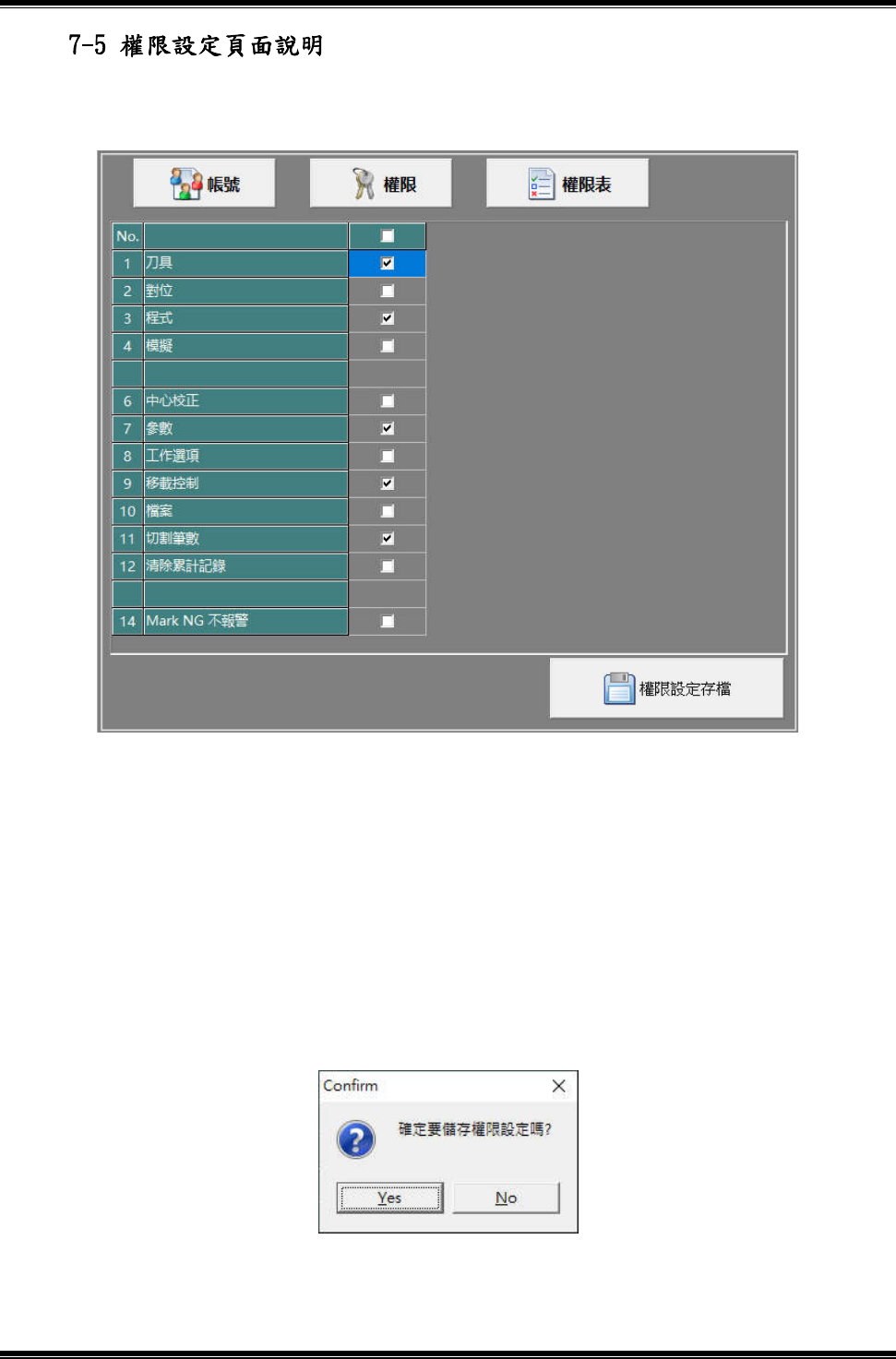 GAM320A 操作說明書 104 1. 此頁面用於設定每一帳號之權限功能開啟或關閉,如圖 7-5-1 。 2. 操作權限設定 : 點擊勾選或取消權限功能列表,即可開啟或關閉該帳號相對應的 權限功能。 3. 完成權限功能設定 : 完成設定後 , 點擊 【權限設定存檔】 鍵 , 出現 確認訊 息提示, 如圖 7-5-2 。 點擊【 Yes 】鍵,系統將會執行權限設定變更存檔。 點擊【 No 】鍵,系統將忽略此次的權限設定修改。 圖 7-5…