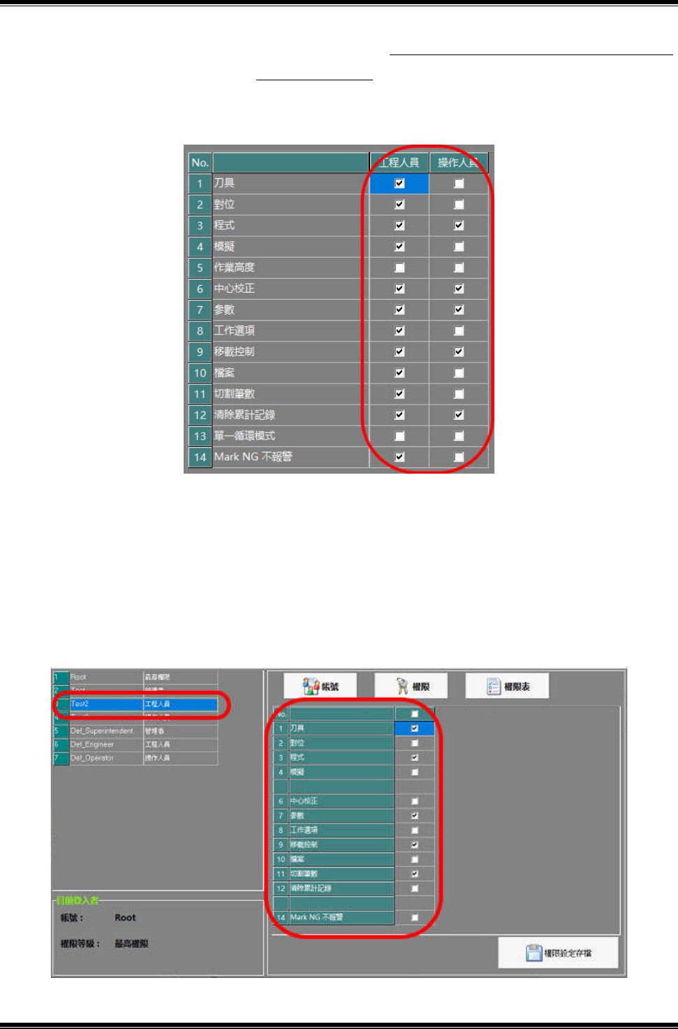 1.此頁面用於設定每一帳號之權限功能開啟或關閉,如圖 7-5-1。