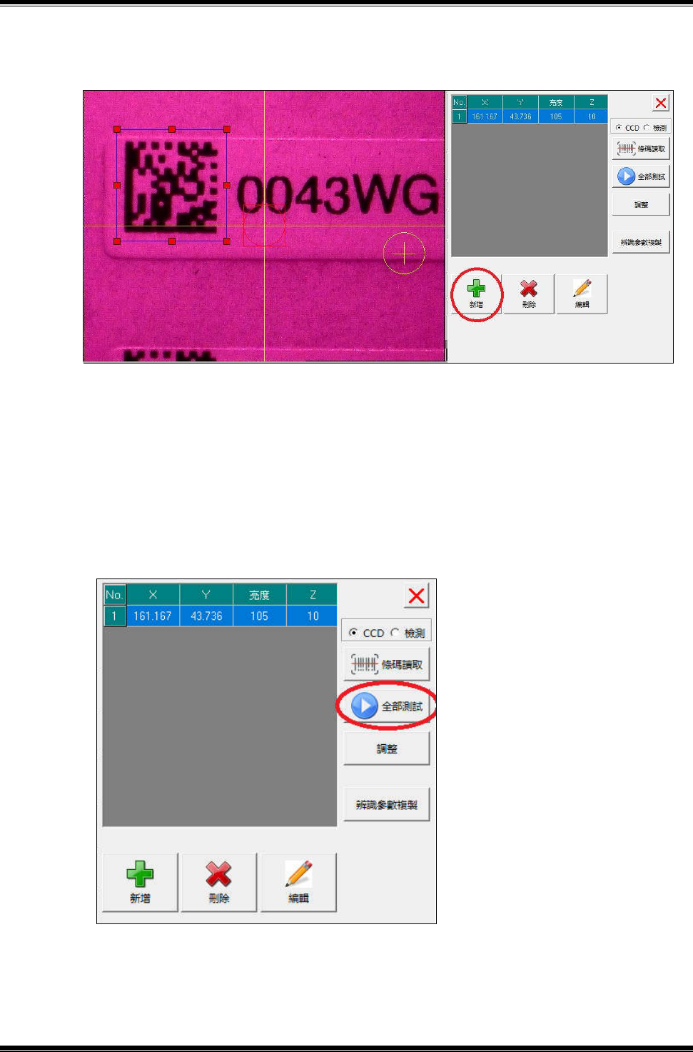 4.調整 CCD 畫面中藍框範圍、位置、CCD 亮度至適當參數,點擊“條碼讀取”鍵,