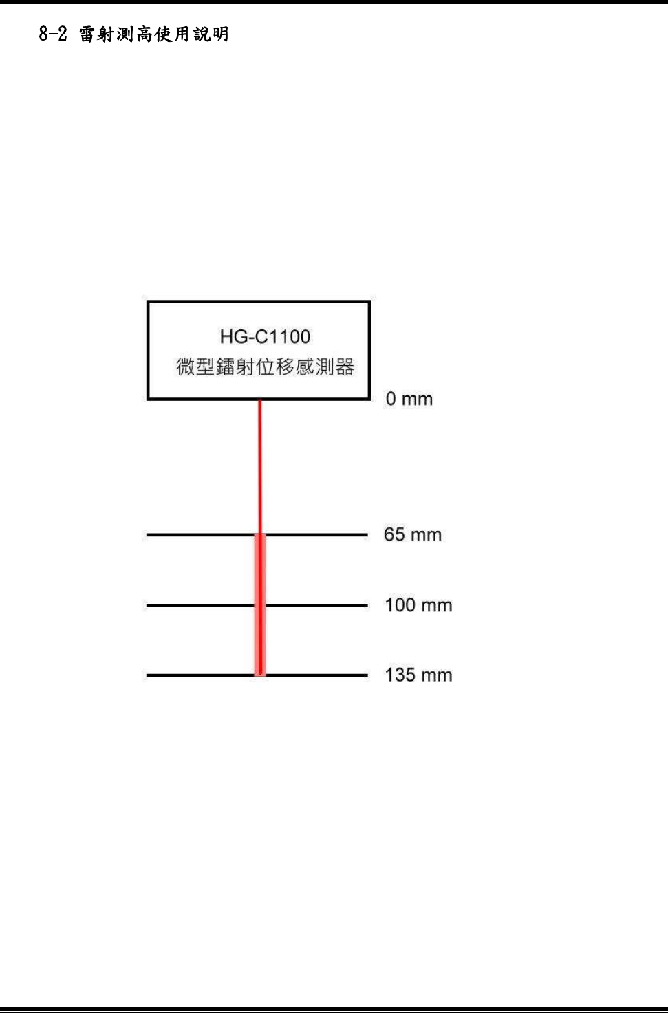 GAM320A 操作說明書 116 1.HG-C1100 微型鐳射位移感測器偵測距離說明 : (1) 測量中心距離: 100mm 。 (2) 測量範圍:± 35mm 。 (3) 光束直徑:约Φ120μm。 (4) 重複精度: 70 μ m 。