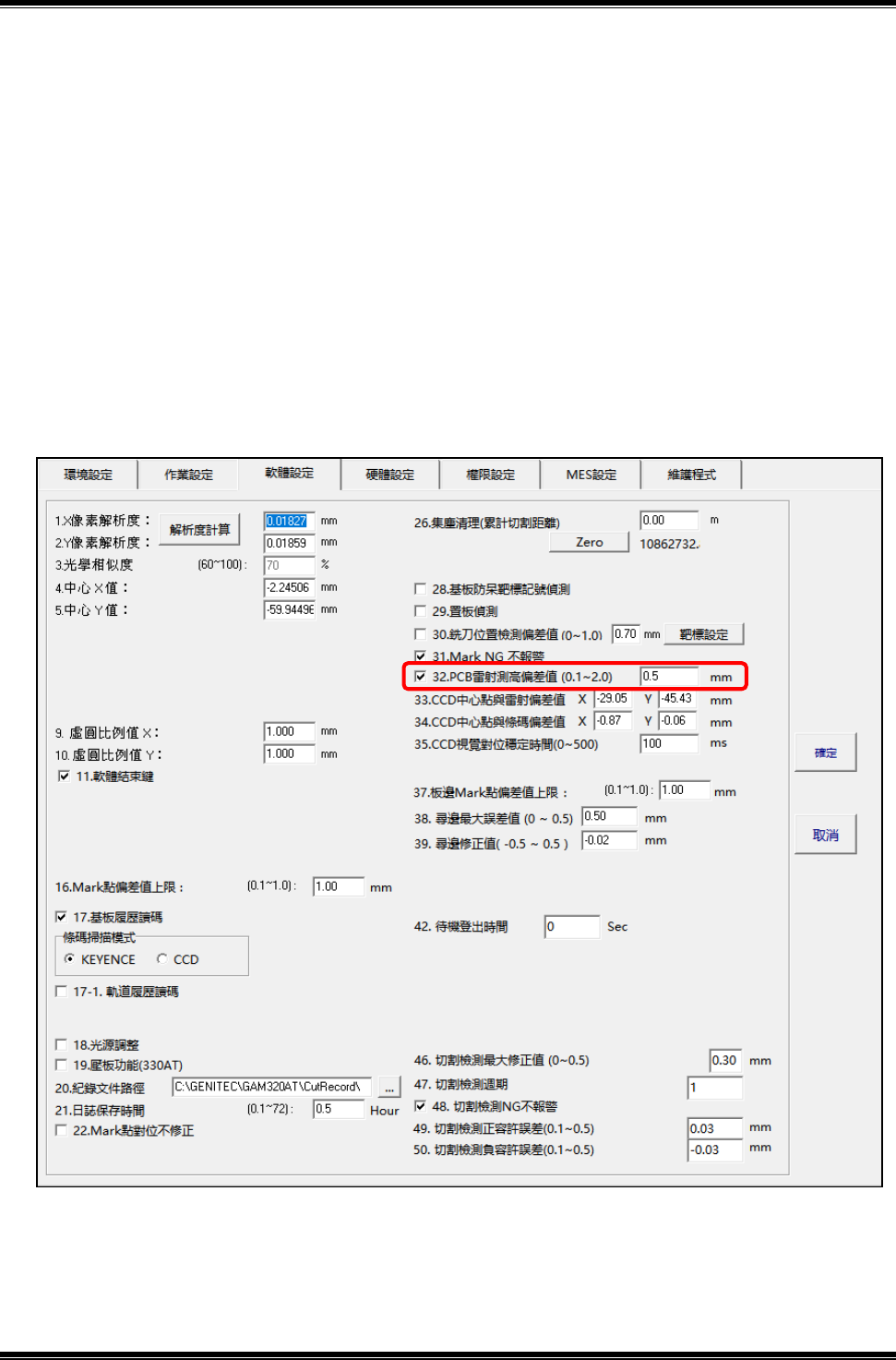 (4)進入【參數】→【軟體設定】頁面,勾選(選項 32.PCB 雷射測高偏差值),如